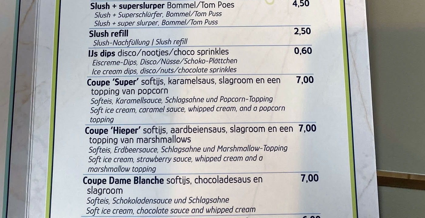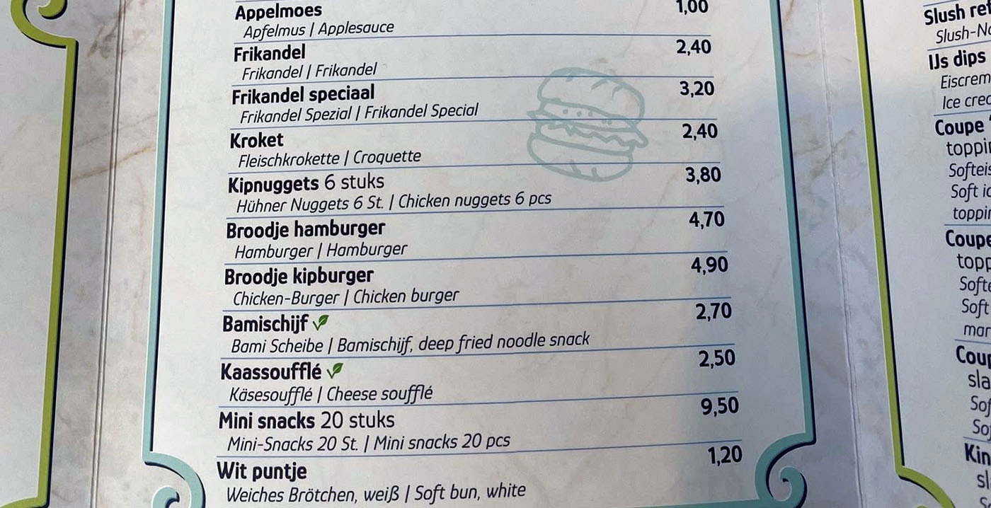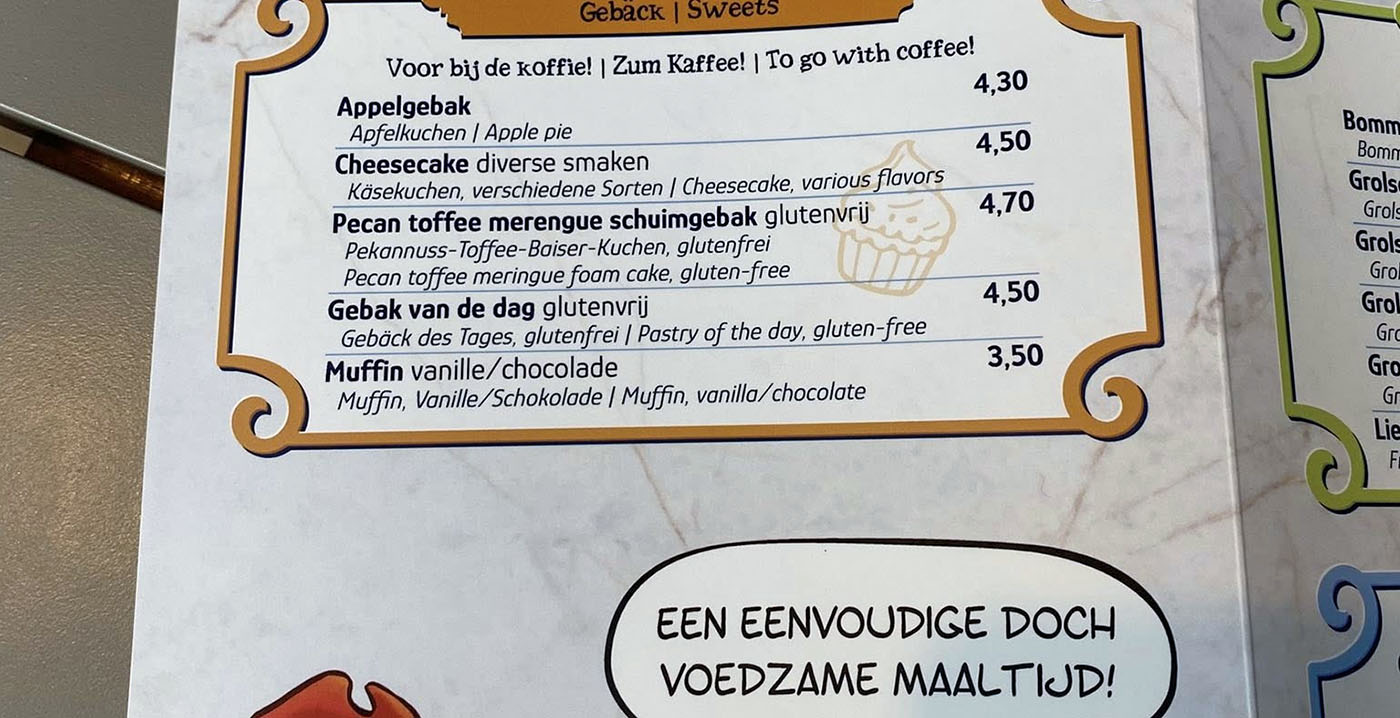 De rest van de kaart bestaat uit lekkernijen voor bij de koffie, zoals appelgebak, cheesecake, schuimgebak en muffins (3,50 tot 4,70 euro) en ijs, waaronder coupes, hoorntjes, milkshakes en slush (2,20 tot 7 euro). Bestellen kan niet alleen aan de kassa, maar ook via bestelzuilen en door een QR-code op een tafel te scannen.