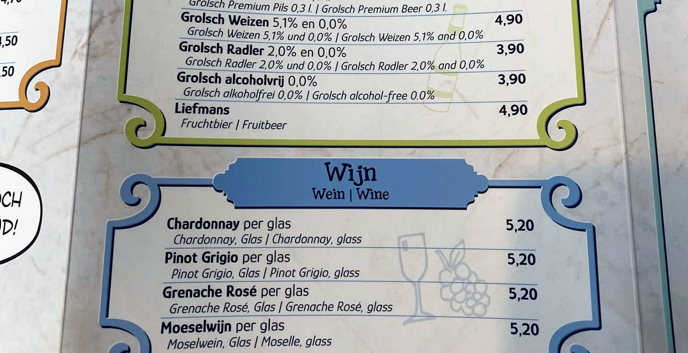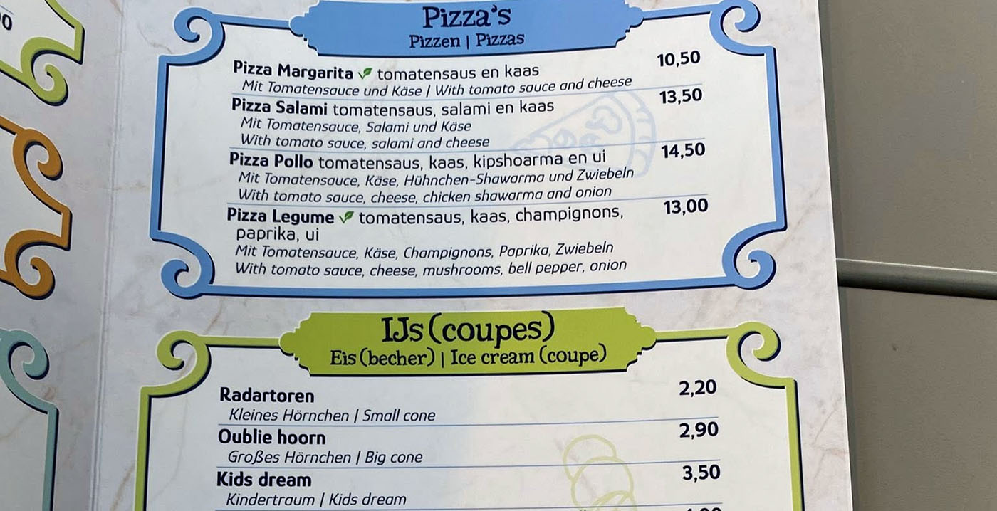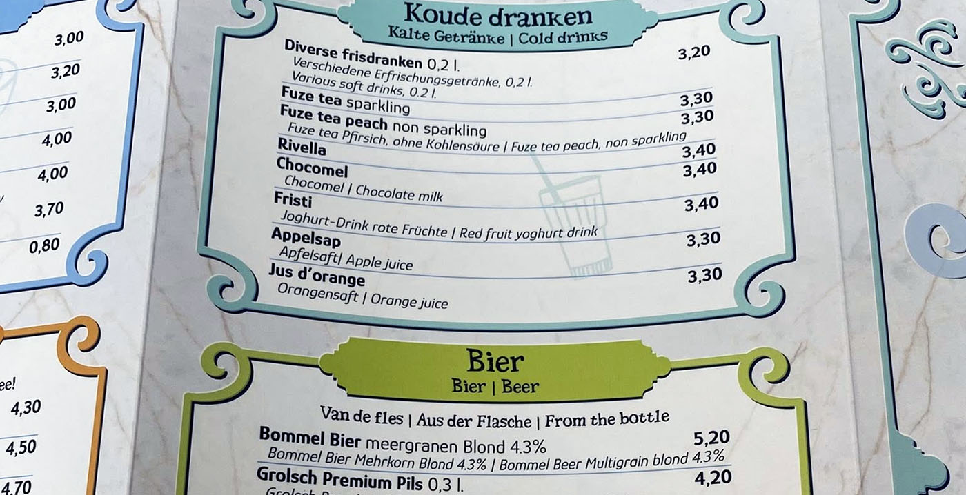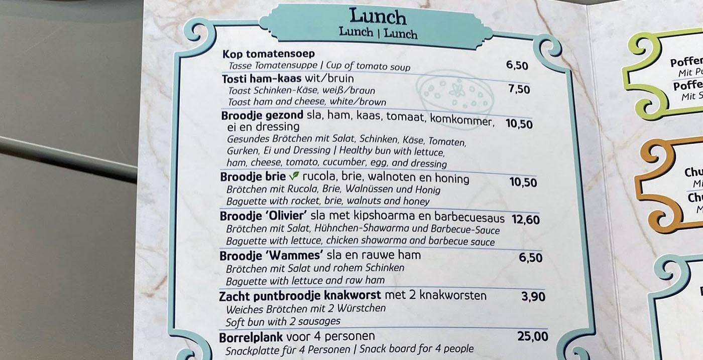 De rest van de kaart bestaat uit lekkernijen voor bij de koffie, zoals appelgebak, cheesecake, schuimgebak en muffins (3,50 tot 4,70 euro) en ijs, waaronder coupes, hoorntjes, milkshakes en slush (2,20 tot 7 euro). Bestellen kan niet alleen aan de kassa, maar ook via bestelzuilen en door een QR-code op een tafel te scannen.