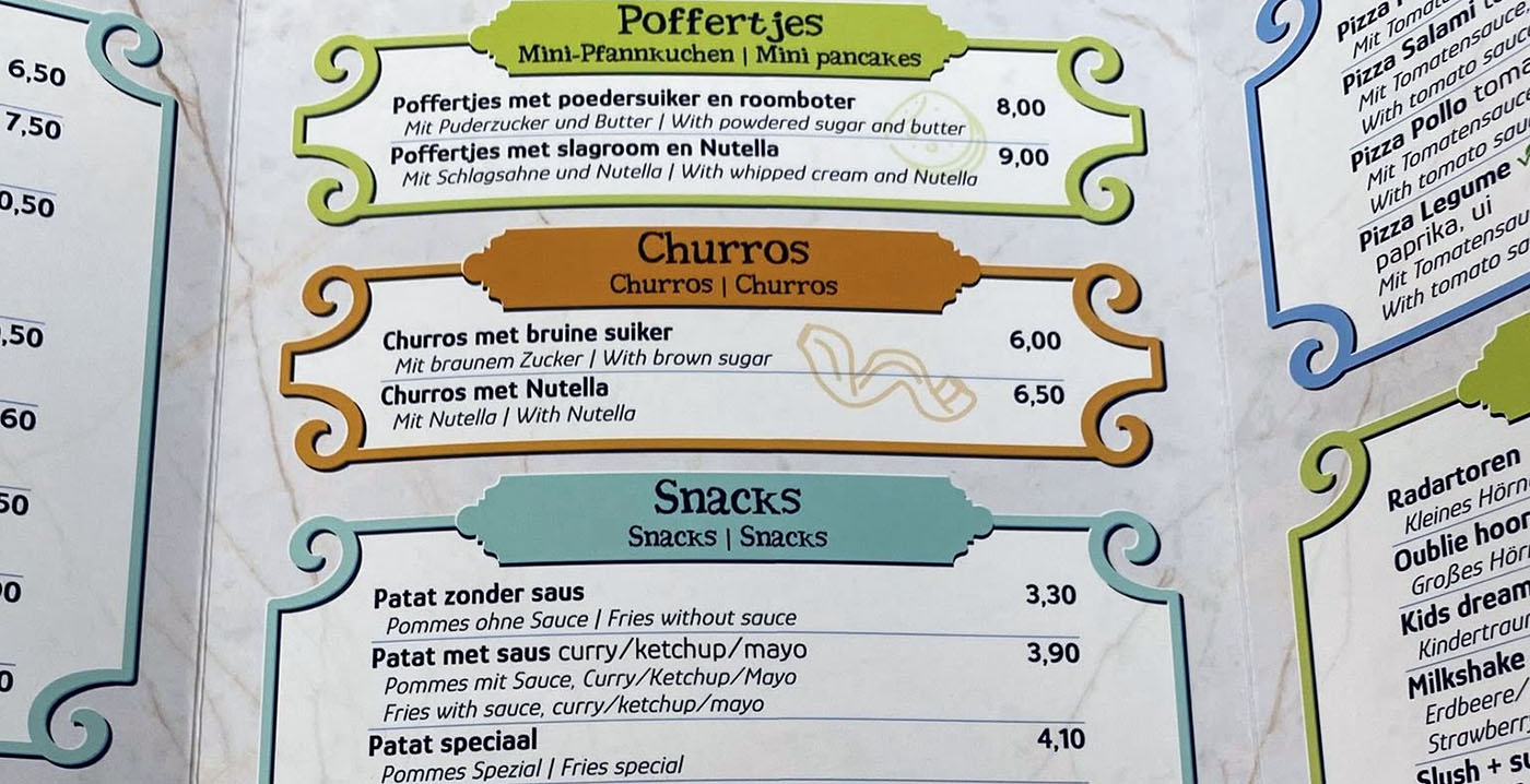 FOTO'S Wat kost een frietje met een cola in het nieuwe Nederlandse pretpark Bommelwereld? Het overdekte attractiepark in Groenlo ging gisteren officieel open voor publiek. Daarmee opende ook voor het eerst Restaurant Cant & Claer, de grote eetgelegenheid in de attractiehal. Het assortiment bestaat uit onder meer pizza's, poffertjes, churros, snacks, broodjes, pannenkoeken en ijs.
