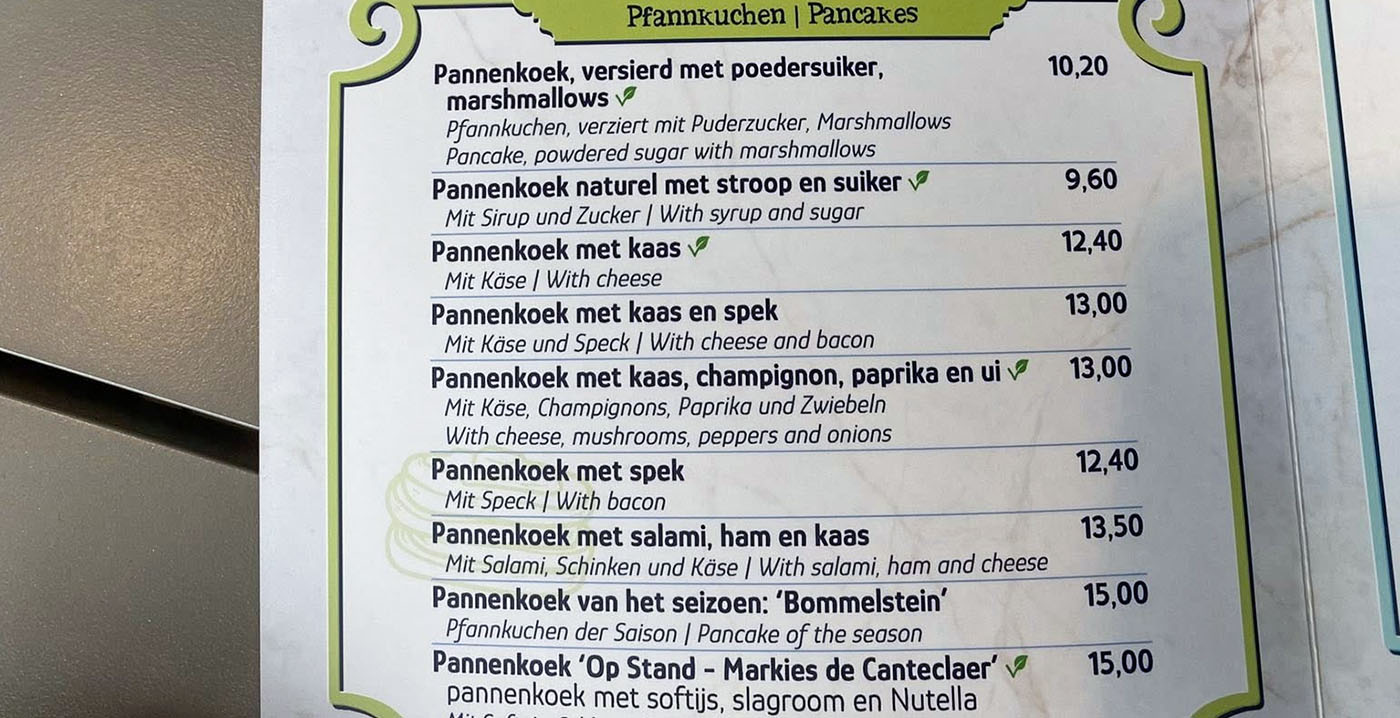 Pannenkoeken zijn er in negen verschillende soorten, zowel zoet als hartig. De prijzen: 9,60 euro voor de goedkoopste pannenkoek, 15 euro voor de duurste. De prijs van een borrelplank voor vier personen is 25 euro. Lunchen kan ook met tomatensoep (6,50 euro) en broodjes gezond, brie, kipshoarma, rauwe ham of knakworst (3,90 tot 12,60 euro).