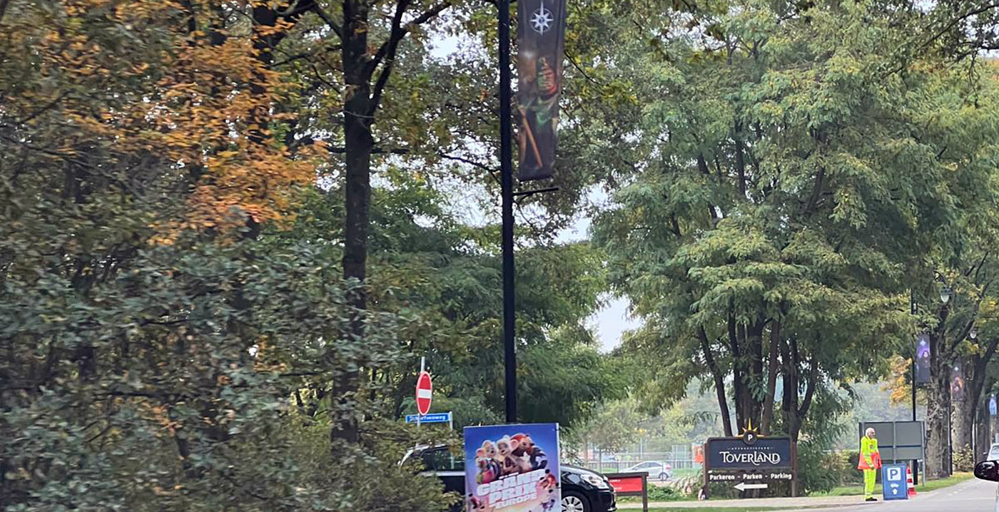 Het gaat om een kartonnen reclamebord dat is vastgemaakt aan een lantaarnpaal waar nota bene een Toverland-vaandel aan hangt. Precies dezelfde uiting verscheen eerder al in Kaatsheuvel, bij een lantaarn langs de aanrijroute richting vakantiepark Efteling Bosrijk en het Efteling Grand Hotel.