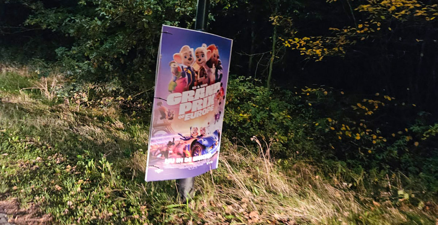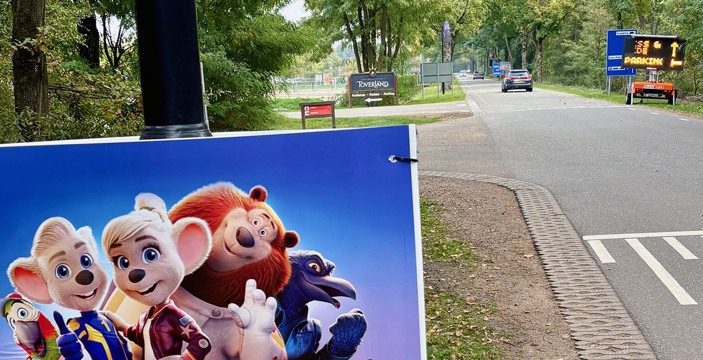 FOTO'S Is het toevallig, of een bewuste keuze? De nieuwe Europa-Park-film Grand Prix of Europe wordt niet alleen gepromoot pal naast de Efteling, maar ook vlakbij de ingang van Toverland. Wie richting het parkeerterrein van het Limburgse attractiepark rijdt, komt de opvallende filmposter tegen.