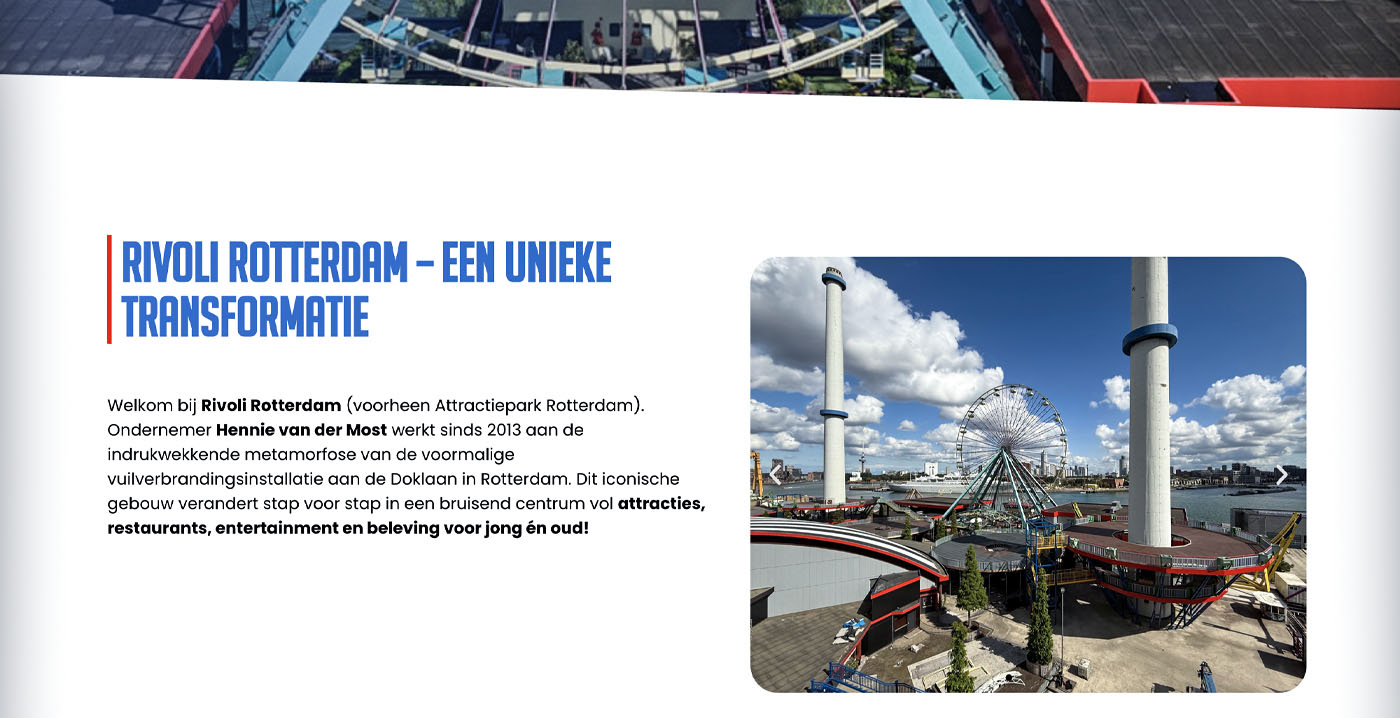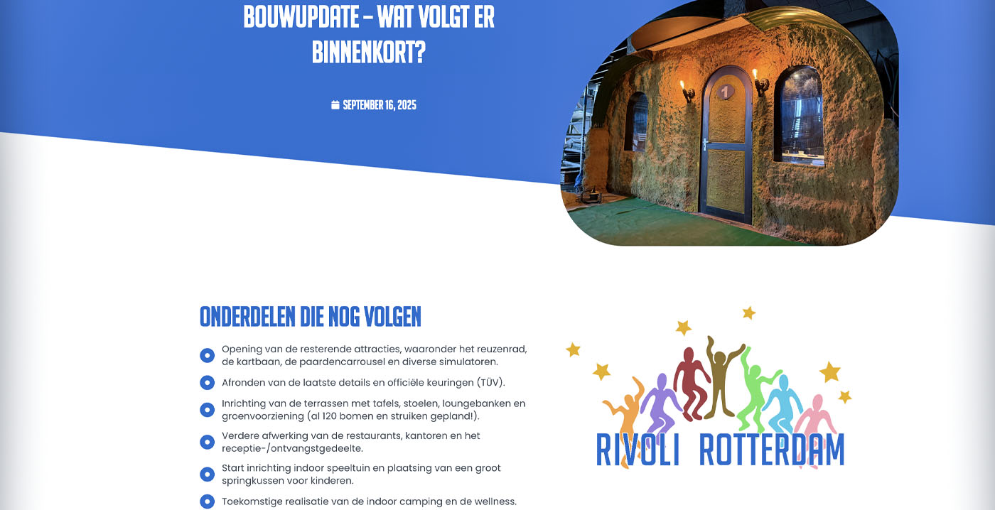 FOTO'S Het vastgelopen pretparkproject in Rotterdam heeft een officiële website gelanceerd: rivoli.nl. Daarop presenteert Rivoli zich als "hét attractiepark van Rotterdam" en doet men alsof de opening slechts een kwestie van tijd is. Bezoekers worden uitgenodigd voor rondleidingen achter de schermen en krijgen optimistische bouwupdates te lezen, terwijl het park na dertien jaar nog altijd niet open is.