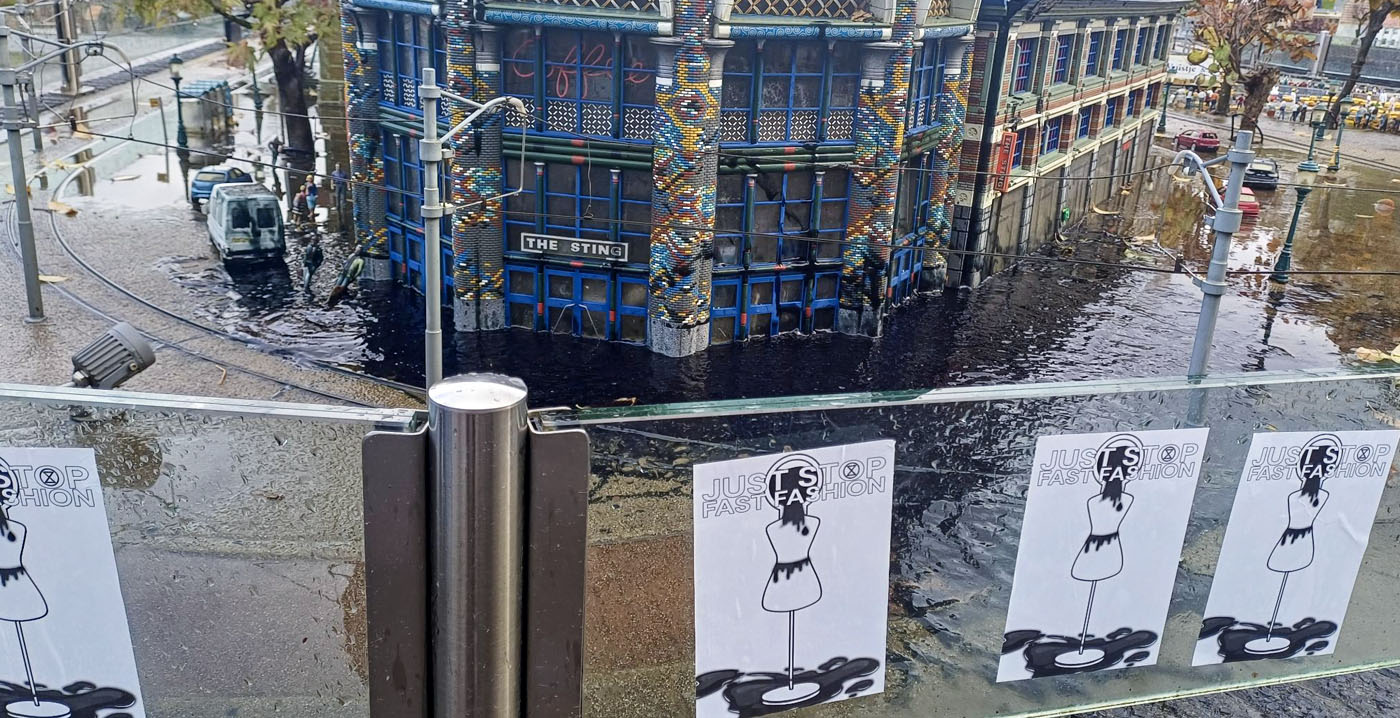 Twee actievoerders van Extinction Rebellion hebben zaterdag in Madurodam een zwarte vloeistof uitgegoten over de miniatuur van kledingwinkel The Sting. De demonstratie, uitgevoerd door de groep Just Stop Fast Fashion, was gericht tegen de vermeende banden van het attractiepark met vervuilende modebedrijven.