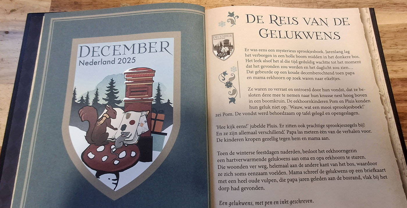 Het PostNL-verhaal, dat De Reis van de Gelukswens heet, wordt vertegenwoordigd door een zegel met eekhoorn en een muisje erop. De bosdieren bladeren door een boek, zittend op een paddenstoel bij een ouderwetse brievenbus. Het sprookje draait om een eekhoorngezin dat in het bos een verborgen sprookjesboek vindt.