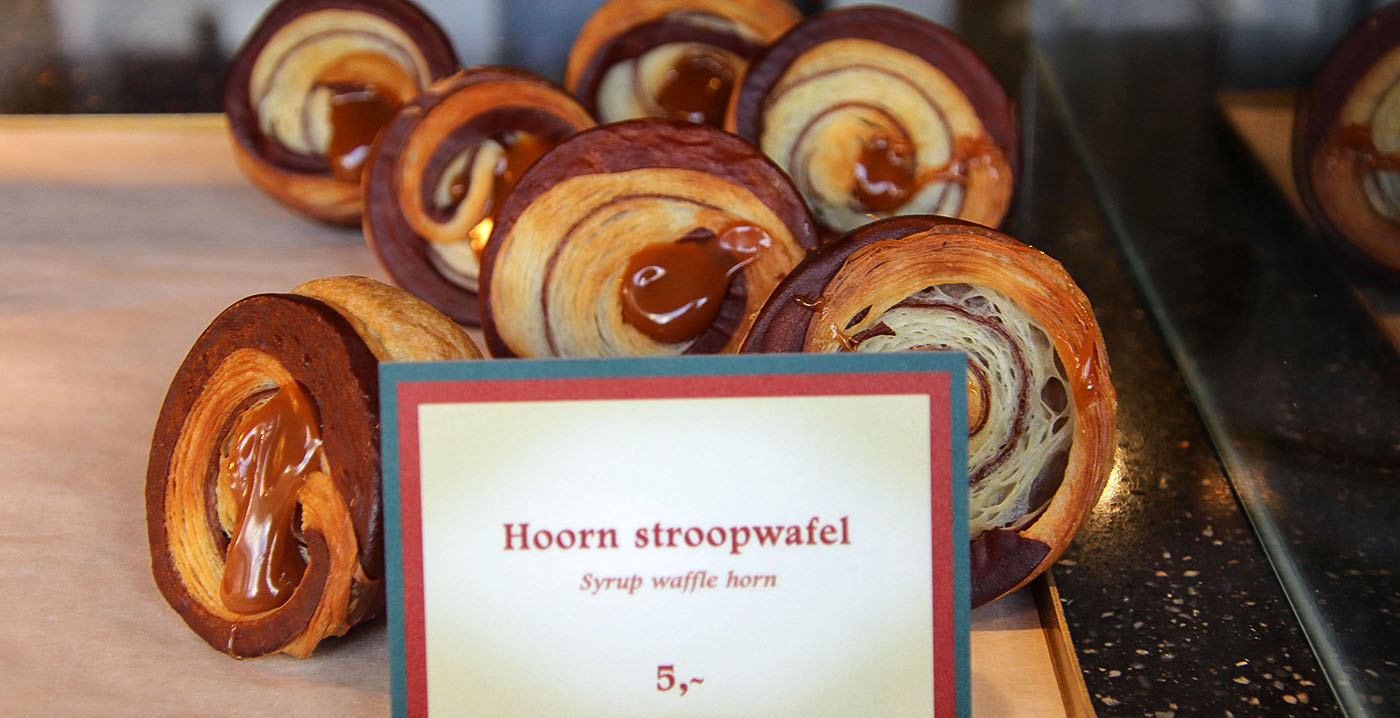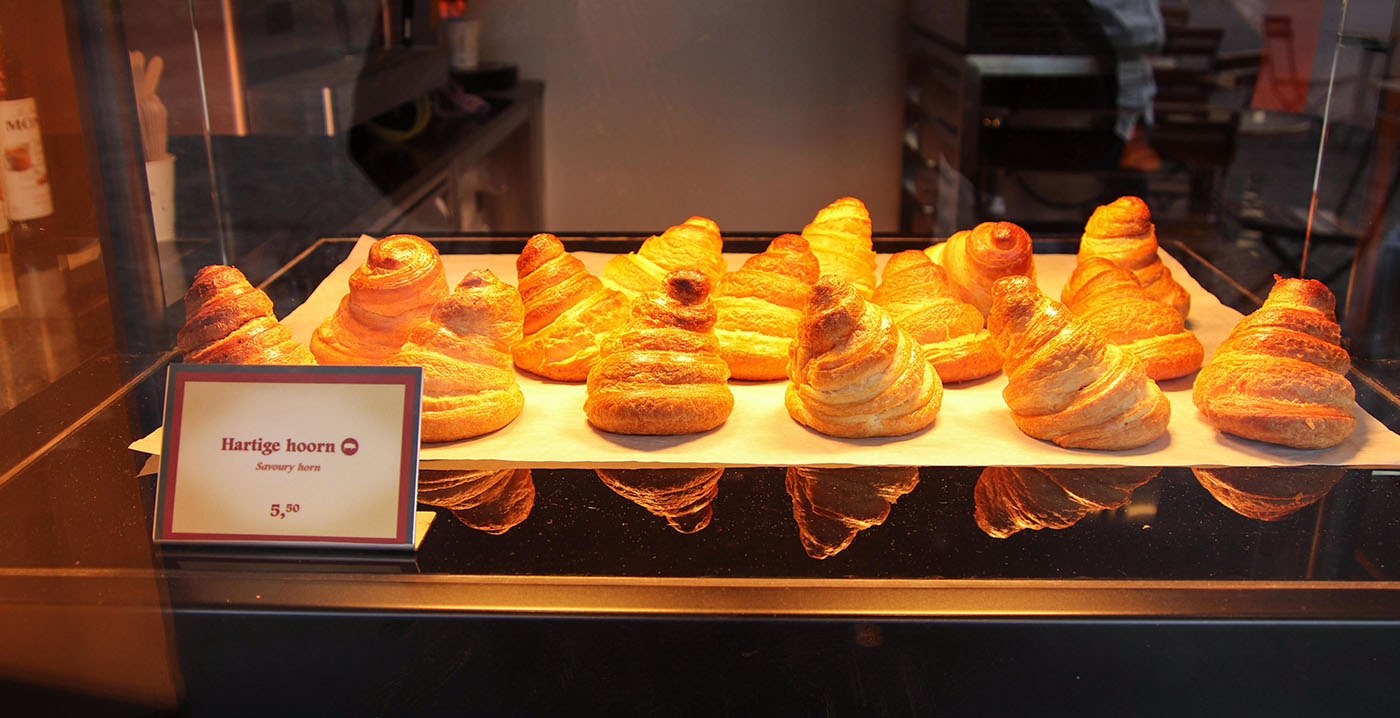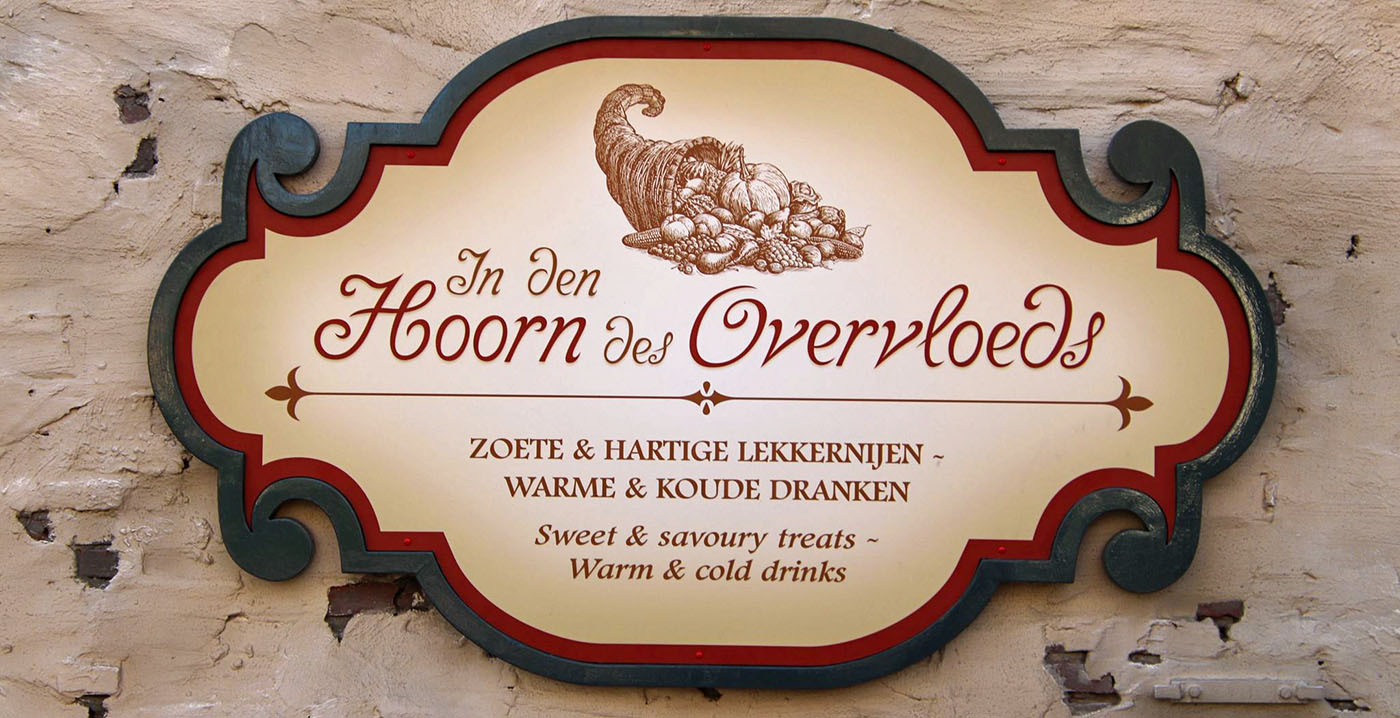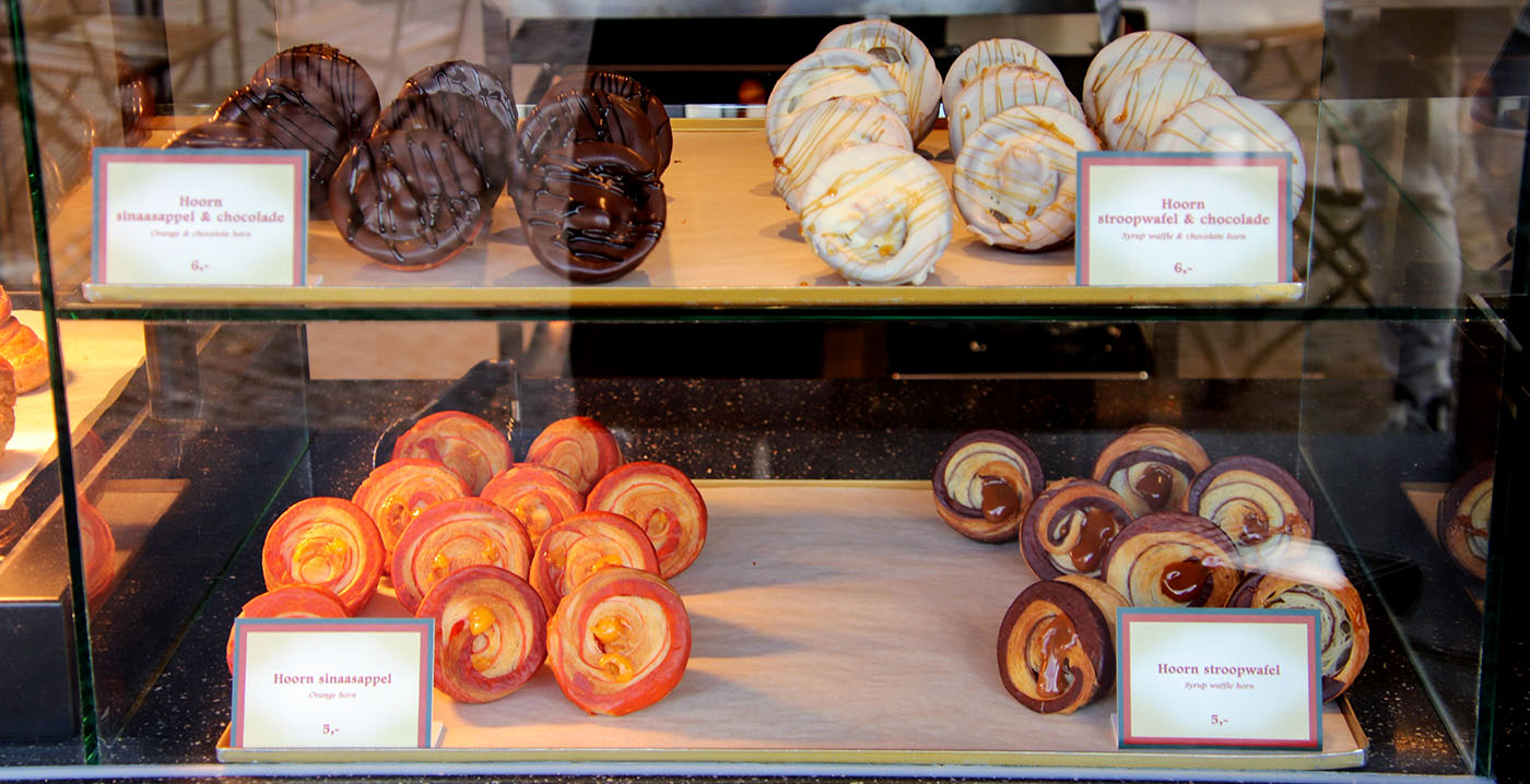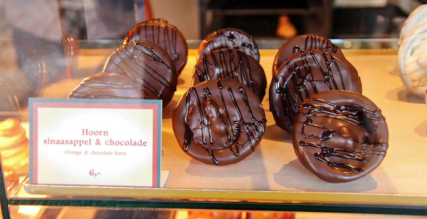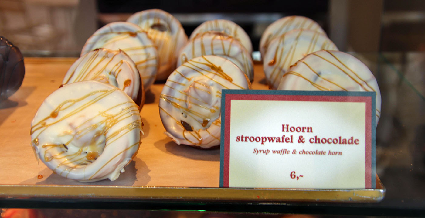 Verder bestaat het aanbod uit krakelingen en dranken, waaronder chocolademelk in dezelfde smaken als de hoorns: sinaasappel en chocolade of stroopwafel en chocolade. Ze kosten 5,85 euro. In den Hoorn des Overvloeds stamt uit 1955. De naam verwijst naar een object uit de Griekse mythologie.