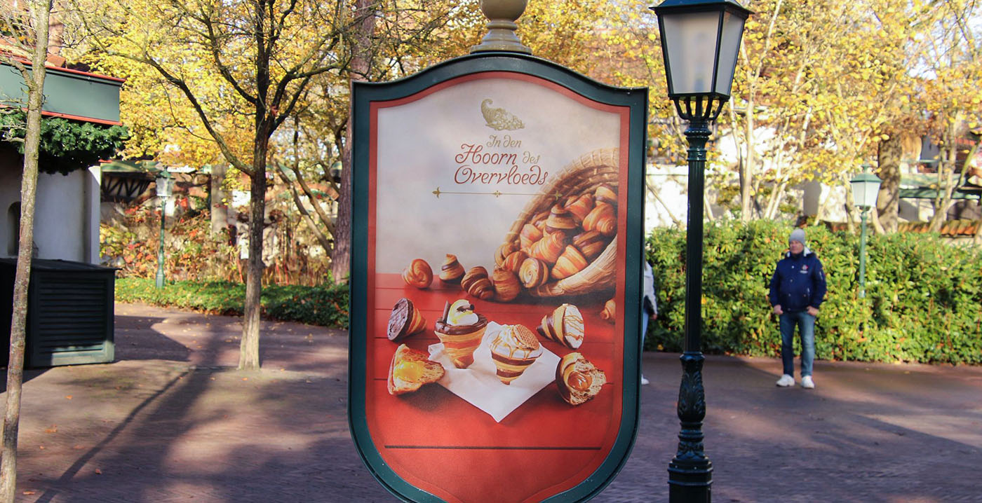 Efteling-bezoekers kunnen bij In den Hoorn des Overvloeds voortaan hoorntjes van croissantdeeg halen, in een zoete en een hartige variant. De hartige versie van 5,50 euro bestaat uit worstenbrood van bakkerij Keilekker. De vier opties voor zoete hoorns zijn sinaasappel, sinaasappel en chocolade, stroopwafel of stroopwafel en chocolade. Ze kosten 5 tot 6 euro.