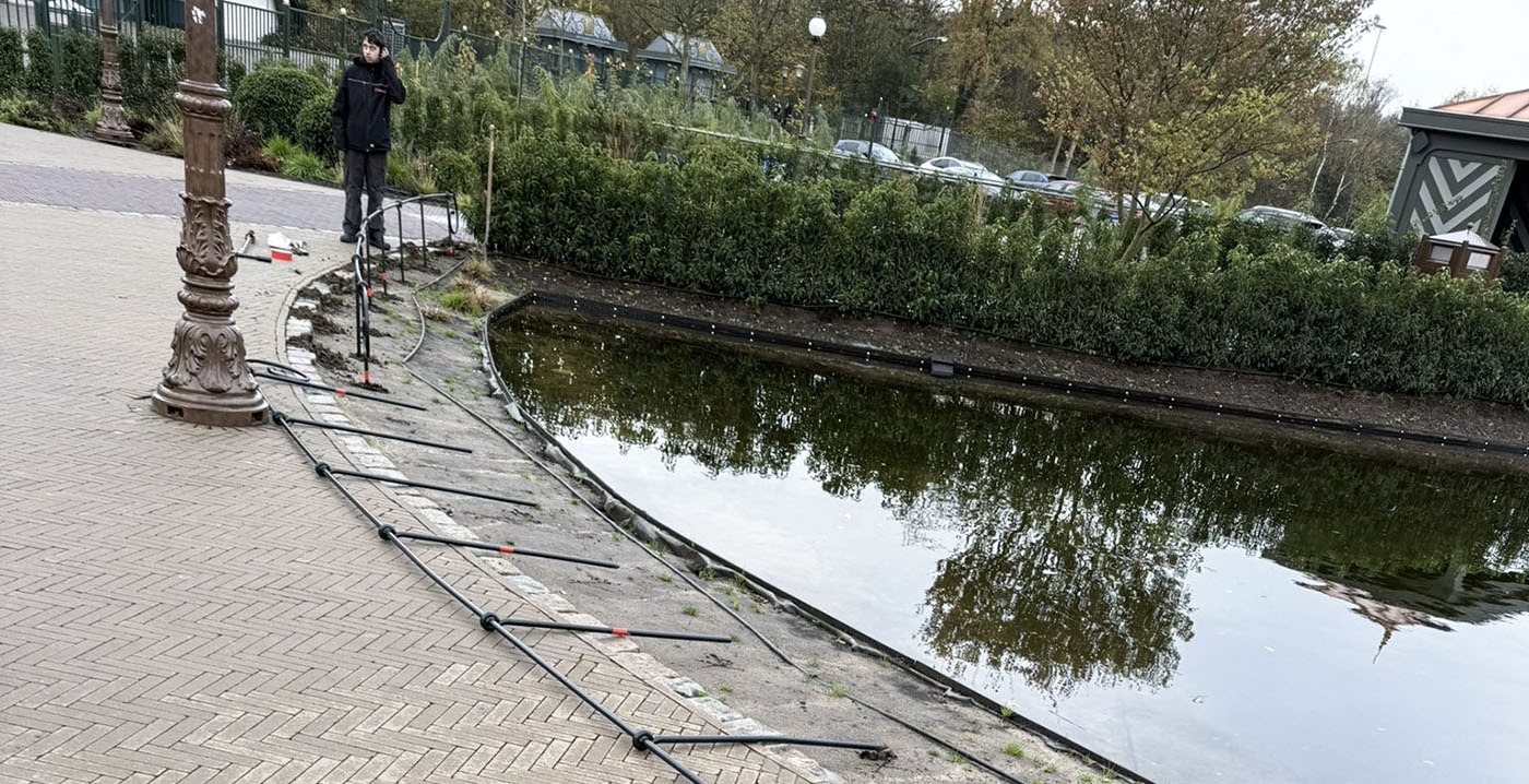 Op een foto is te zien hoe men bezig is met het plaatsen van een metalen afbakening, bestaand uit dunne verticale staanders waar een horizontale stang doorheen loopt, langs de randen van de vijvers. Het gaat om een typisch Efteling-hek: geen opvallende barrière, maar een subtiele begrenzing met krullen aan de uiteinden.