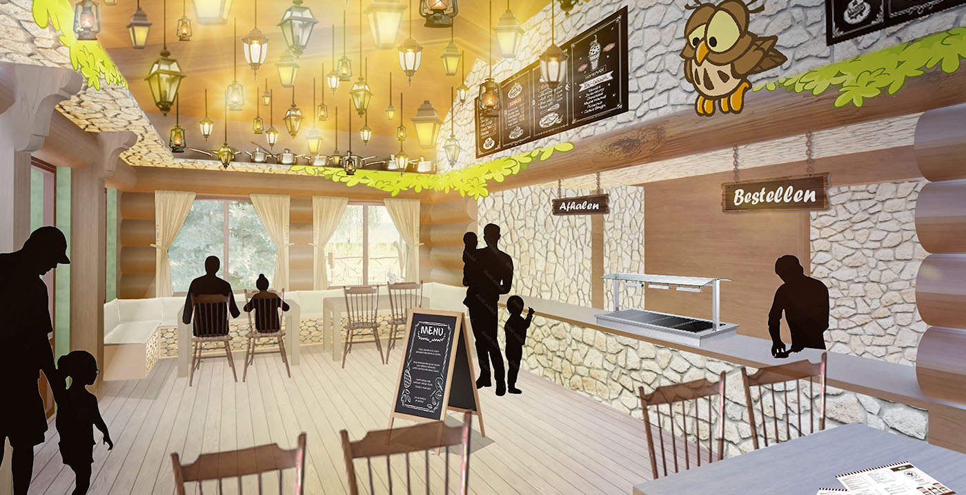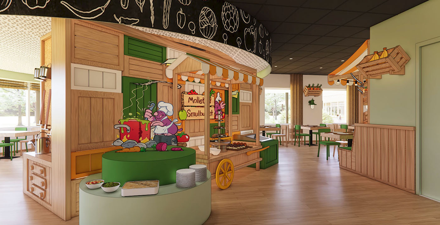 Via een pergola met lampionnen wandelen gasten straks naar twee restaurants: Molletjes Smulbuffet en Tantes Pannenkoek. Een hapje eten kan ook bij Uiltjes Friethuis en Familierestaurant Klieder. Even verderop ligt waterspeeltuin De Toverbron, bestaand uit een rotspartij met een waterval en een vijver met springfonteinen.
