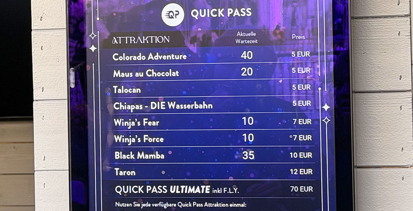 Omgerekend kost een ritje in F.L.Y. zonder te wachten nu 14 euro per persoon. Voordringen bij Colorado Adventure, Maus au Chocolat, Talocan en Chiapas kan momenteel voor 5 euro per attractie. Winja's Fear en Winja's Force kosten nu 7 euro per stuk. De duurste attracties zijn Black Mamba (10 euro) en Taron (12 euro).