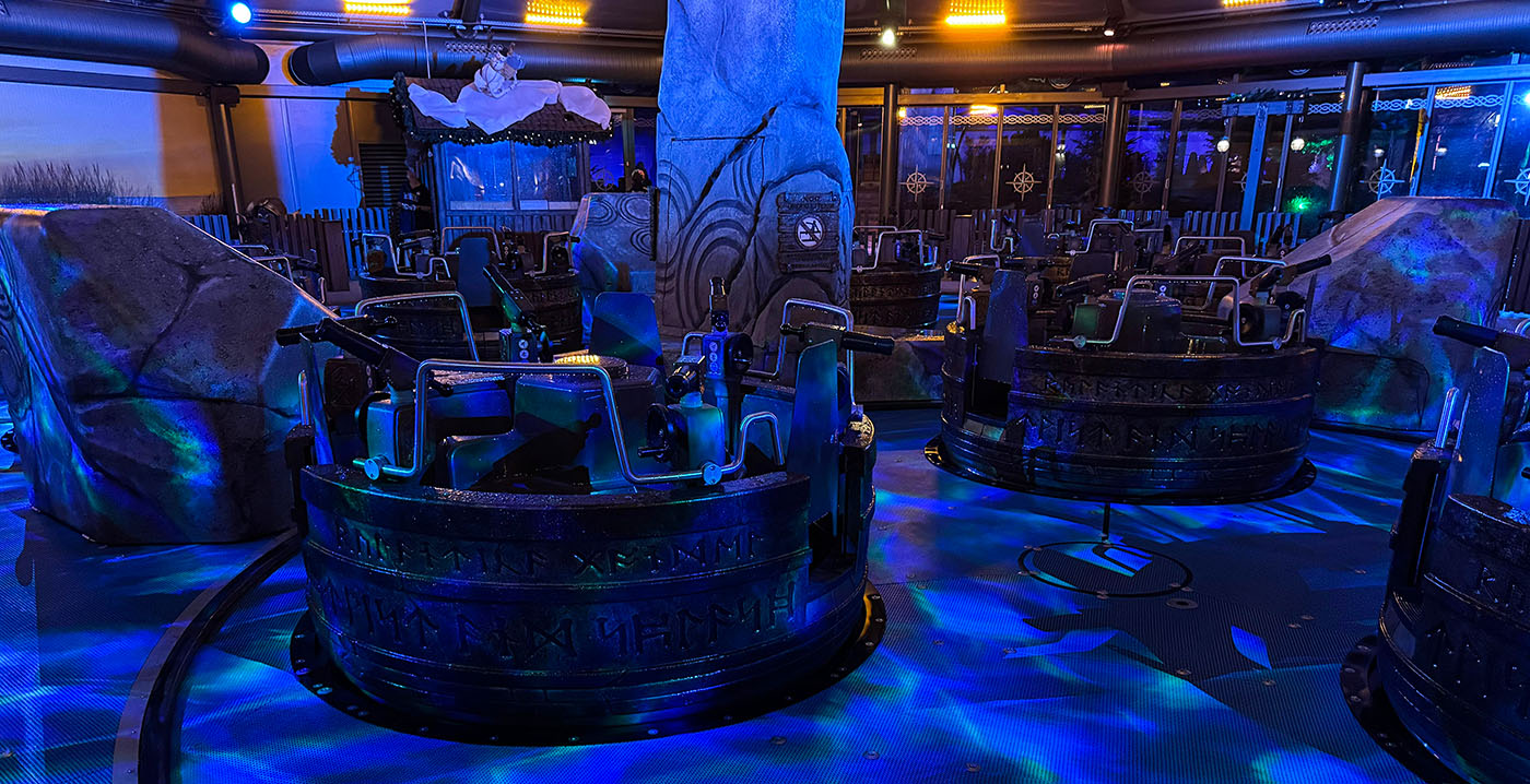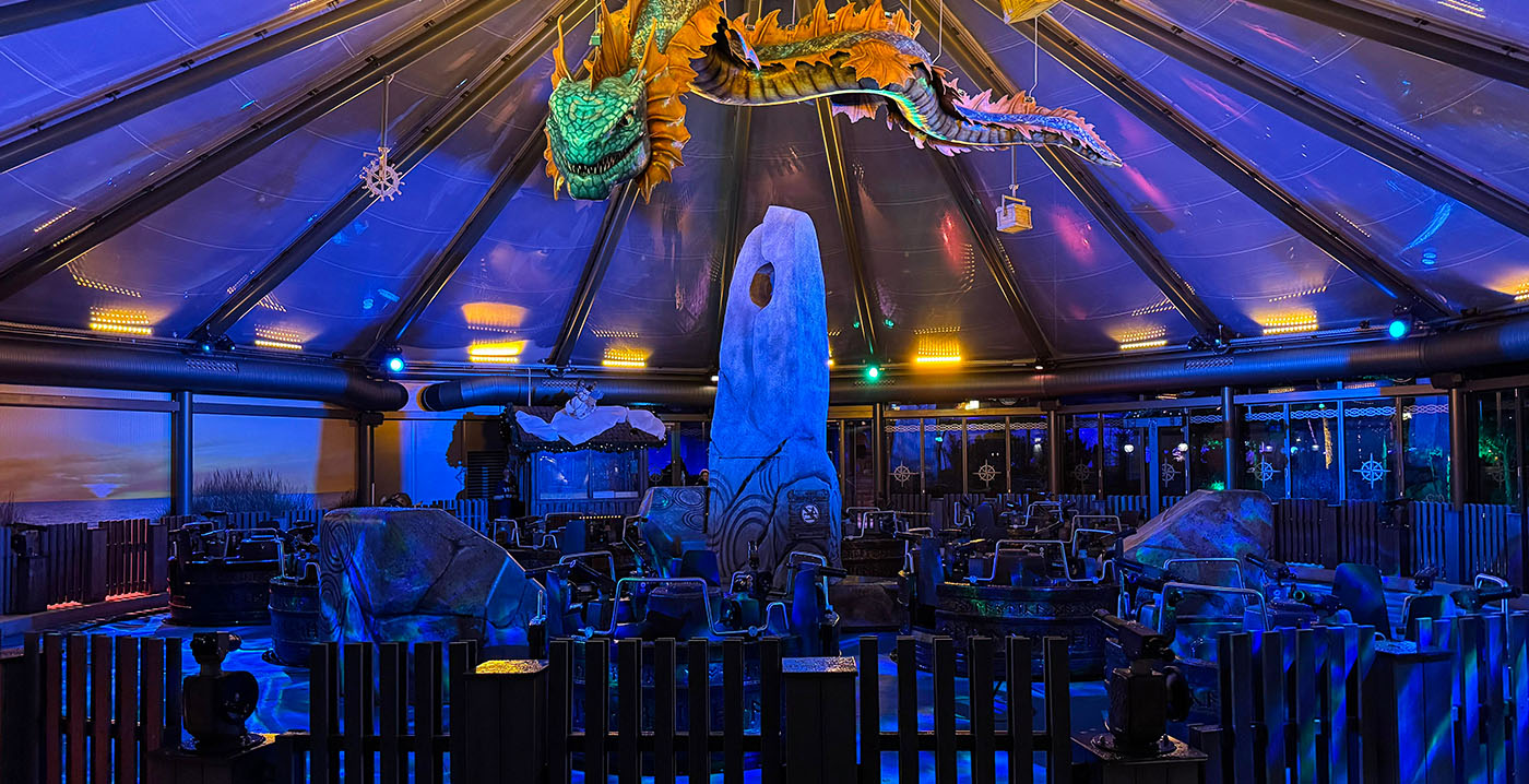 Een enorm decorelement van het mythische wezen hangt boven de carrousel, die vorig jaar voorzien werd van een permanente overkapping. Aan het dak hangen ook verschillende andere objecten, waaronder kisten. Het is niet de eerste beeltenis van Svalgur: het personage komt op verschillende plekken in het waterpark terug. Ze heeft ook haar eigen waterglijbaan Svalgur Rytt.