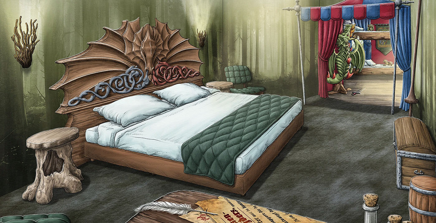 FOTO'S De Efteling laat zien hoe twee nieuwe themasuites in het Efteling Wonder Hotel eruit komen te zien. Looopings kon eerder al melden dat er plannen waren voor hotelkamers in de stijl van familieachtbaan Max & Moritz en houten achtbaan Joris en de Draak. Vandaag komen voor het eerst ontwerpen naar buiten van beide kamers.