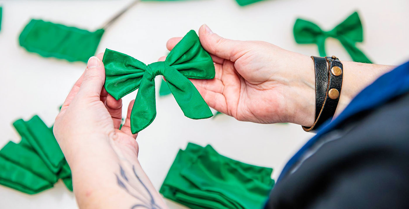 FOTO'S De Efteling geeft de stof van de grootste strik ter wereld, waarmee afgelopen zomer een Guinness World Record werd gevestigd bij de opening van het Efteling Grand Hotel, een nieuwe bestemming. Het groene lint wordt hergebruikt voor miniatuurstrikjes én als decor in de reizende familiemusical over Joris en de Draak.