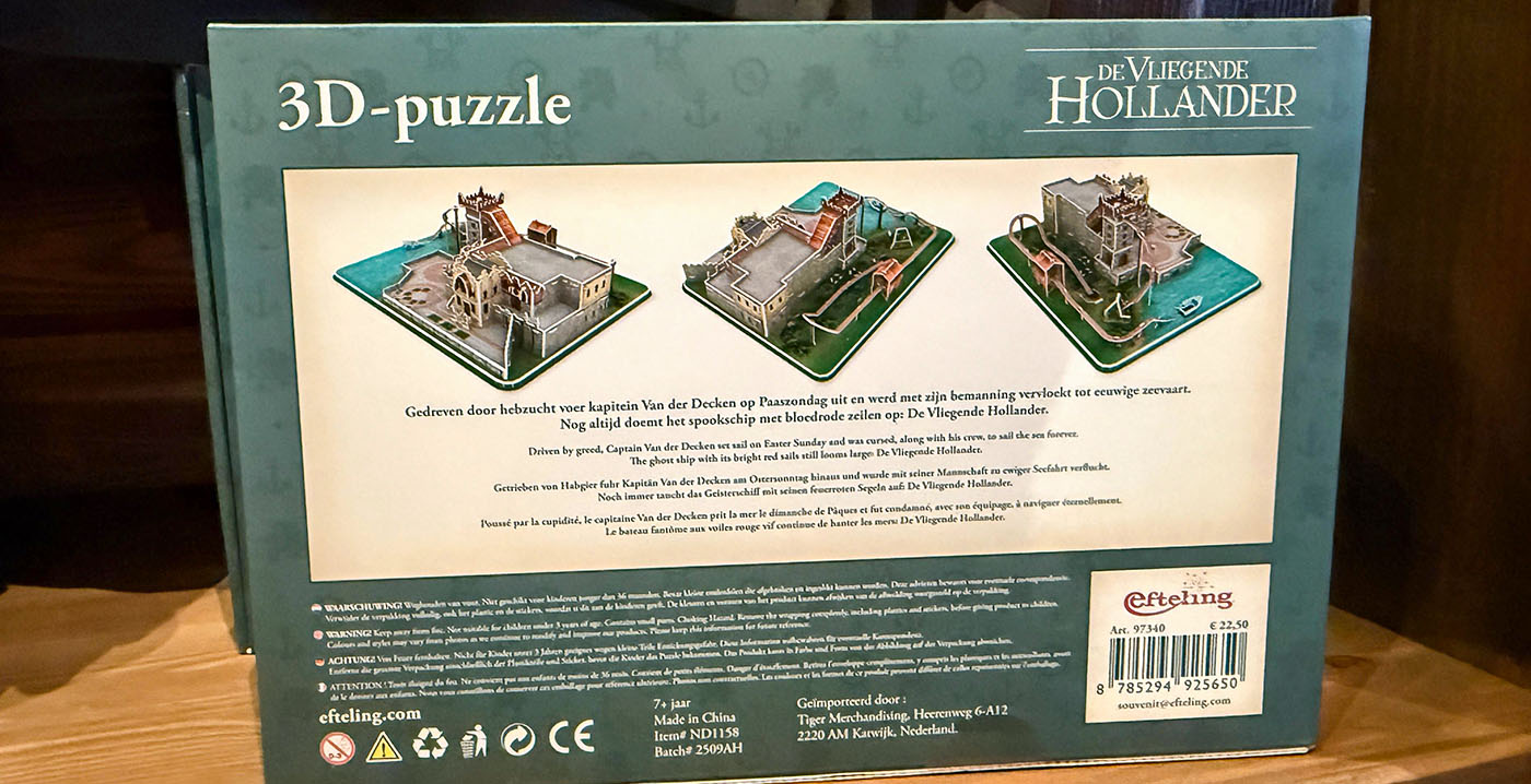 Op de verpakking staat het achtergrondverhaal van De Vliegende Hollander. De eerste 3D-puzzels van de Efteling verschenen eind 2023. Toen werden pakketten uitgebracht van dive coaster Baron 1898, darkride Symbolica en paardenshow Raveleijn.