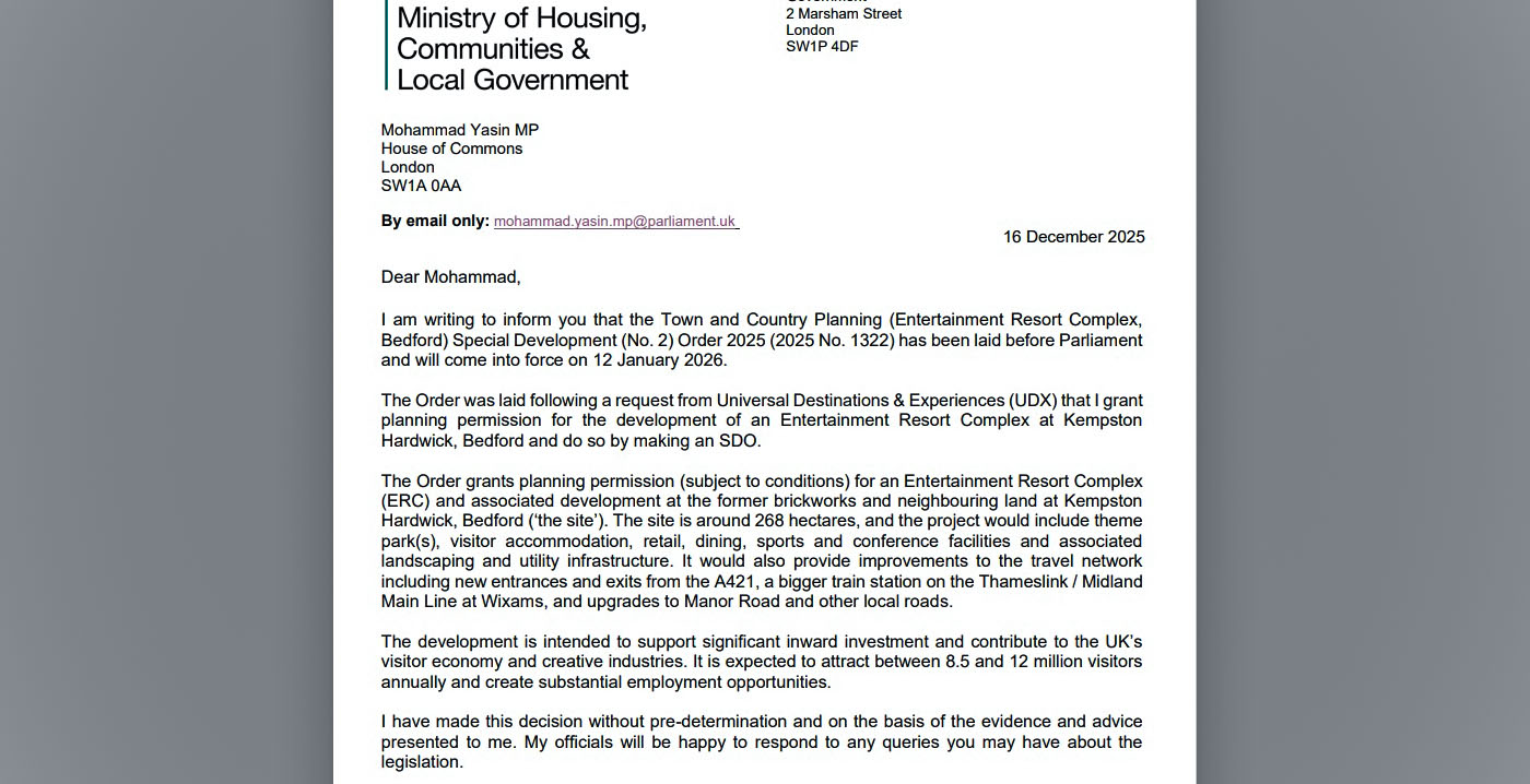 Het langverwachte Universal Studios-pretpark in Engeland heeft een belangrijke juridische horde genomen. De Britse overheid verleent officieel toestemming voor de bouw van een groot Universal-entertainmentresort bij Bedford. De zogenoemde Development Consent Order is toegekend en treedt op 12 januari in werking, blijkt uit een brief van minister Steve Reed aan het Britse parlement.