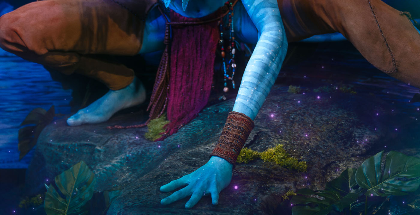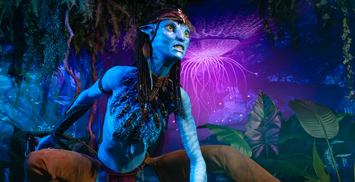 Neytiri poseert in een krijgershouding, met traditionele Omatikaya-kleding en een Na'vi-dolk. Ze staat in een decor dat verwijst naar de heilige Tree of Souls uit de Avatar-films, met gloeiende wortels, bioluminescente planten en lichteffecten. De initiatiefnemers willen bezoekers onderdompelen in de fictieve wereld van Pandora.