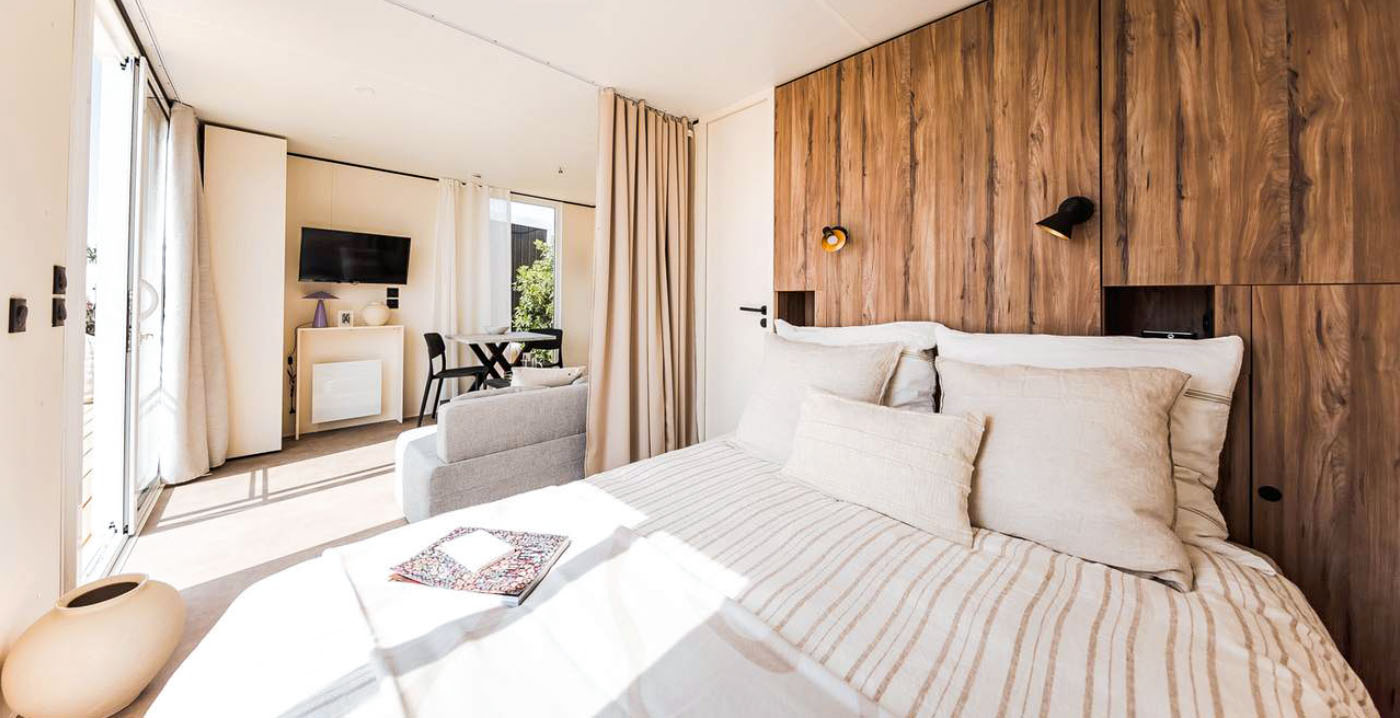 De huisjes beschikken onder meer over een veranda. Binnen bevinden zich een zit- en eethoek met open keuken, een slaapruimte met twee losse bedden en een badkamer met douche, wastafel en toilet. Verder zijn voorzieningen als een koelkast met vriesvak, vaatwasser, koffiezetapparaat, televisie en combimagnetron aanwezig.