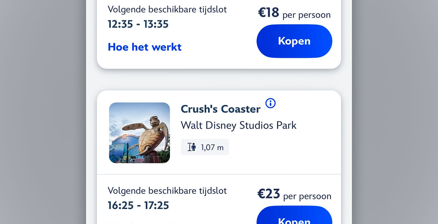 Daar vraagt men 18 euro voor, per persoon en per attractie. Maar het kan dus nog duurder: wie geen zin heeft om in de rij te staan bij Crush's Coaster, tikt 23 euro per persoon af voor toegang tot de speciale Premier Access-rij. Daarmee besparen bezoekers een wachtrij van ruim een uur. Van alle populaire attracties in het Disney-resort heeft Crush's Coaster waarschijnlijk de laagste capaciteit.