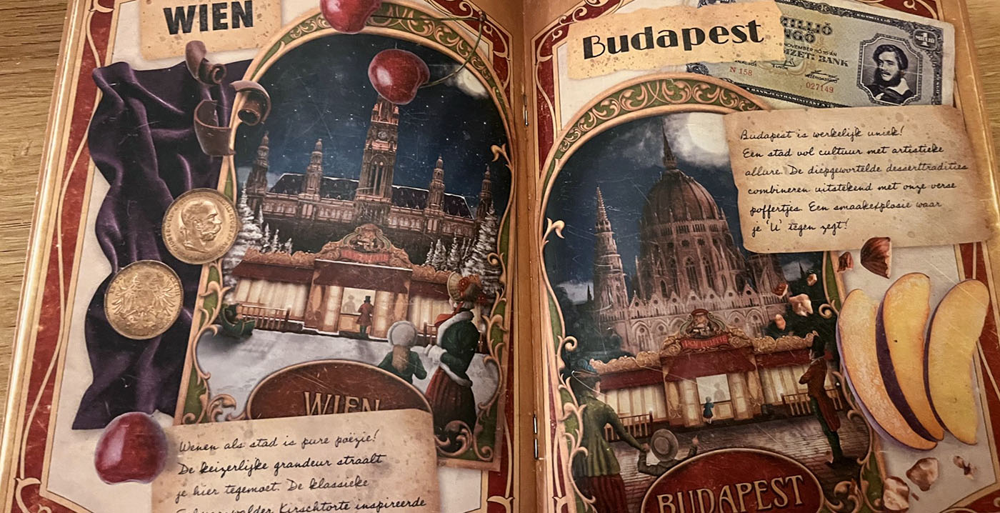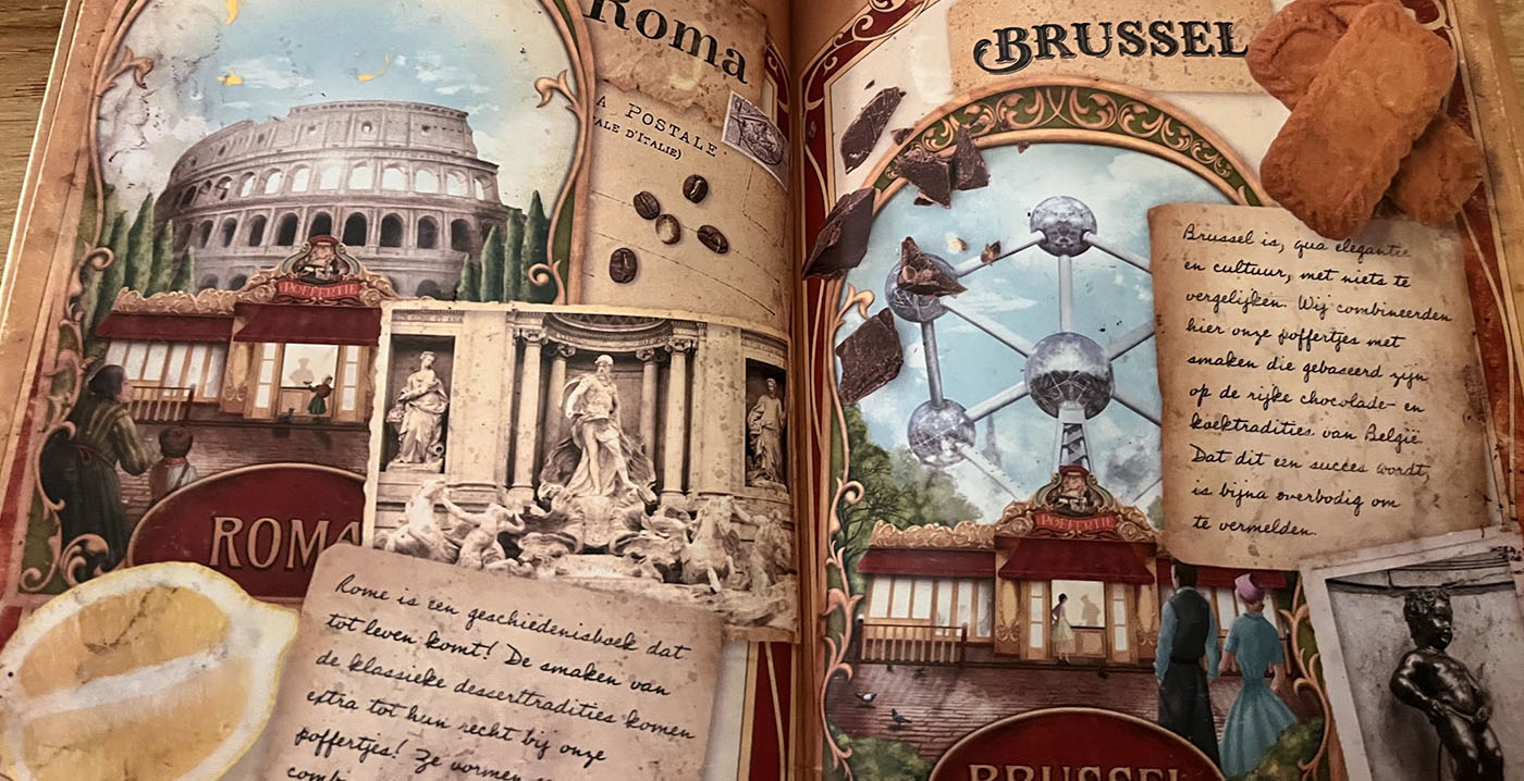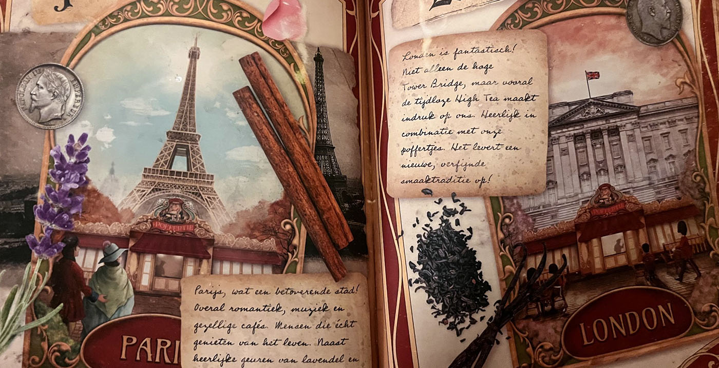 Die fictieve historie komt terug in het rijkelijk vormgegeven menuboekje, waar we afbeeldingen zien van 't Poffertje in Berlijn, Praag, Parijs, Londen, Wenen, Boedapest, Rome en Brussel. Er staan aantekeningen bij met weetjes over de Europese steden. Verschillende plaatsen hebben ook eigen nisjes in het restaurant.