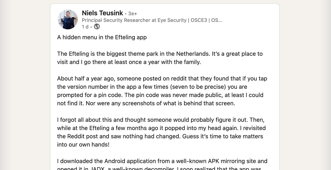 De onderzoeker deelt de pincode niet openbaar, al zal iedereen die de openingsdatum van de Efteling kent vermoedelijk wel een weloverwogen gok kunnen doen. Volgens Teusink vormt het bestaan van het verborgen menu geen direct risico voor de Efteling, maar laat het wel zien dat interne testfuncties in de publieke app aanwezig zijn gebleven.