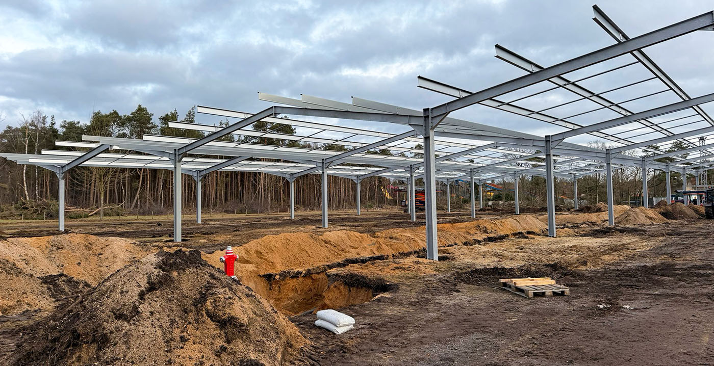 De bouw van carports op de parkeerplaats van Avonturenpark Hellendoorn is gestart. Bezoekers gaan hun auto parkeren onder overkappingen met zonnepanelen. Inmiddels staan de eerste constructies overeind, zo is te zien op foto's. Het project moet afgerond zijn vóór de start van het nieuwe pretparkseizoen in april.
