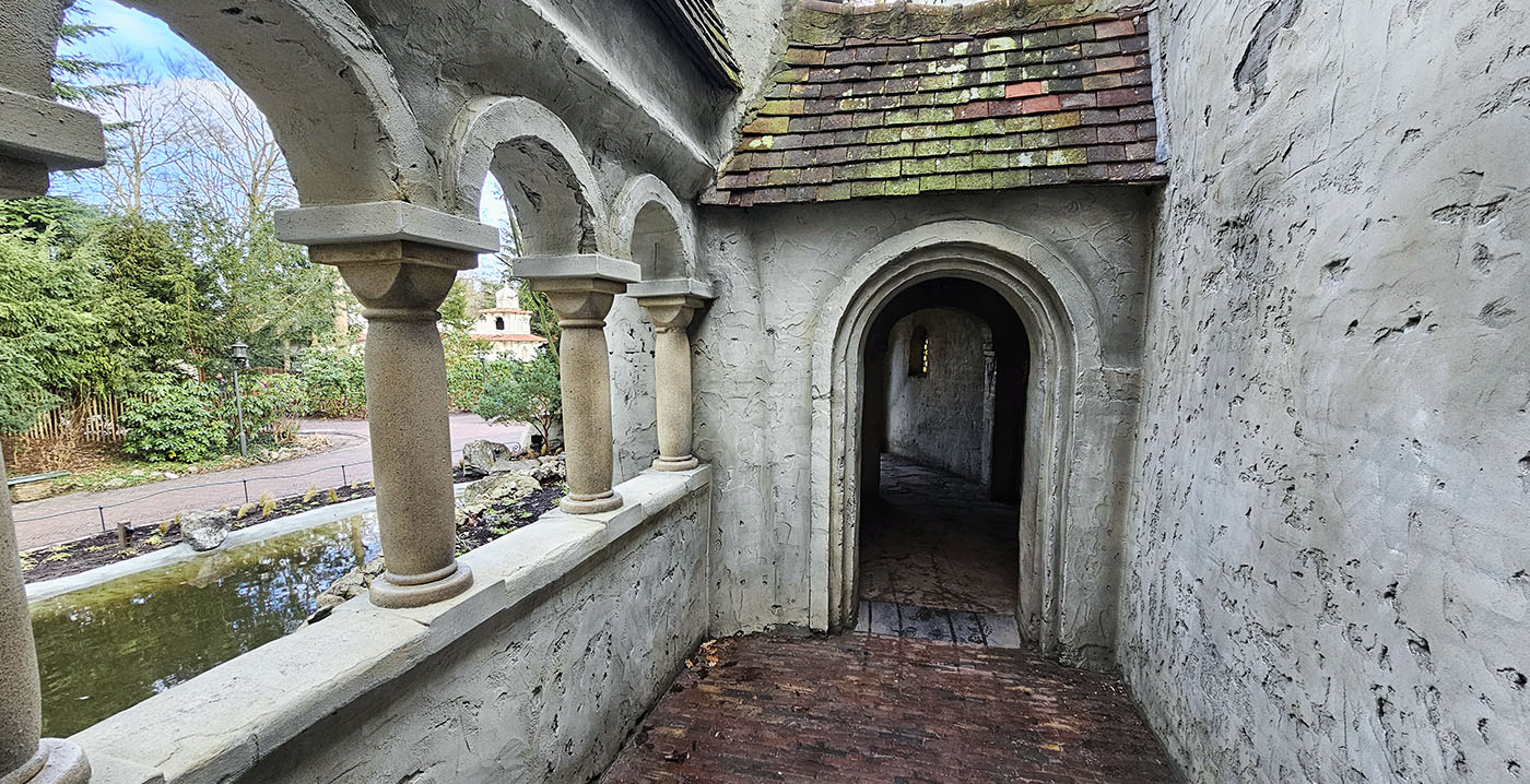Het Meisje met de Zwavelstokjes is vormgegeven als een klein, middeleeuws stadje, gebouwd op een kunstmatige verhoging. Via een stadspoort en een korte entreegang komen bezoekers eerst langs een diorama met een besneeuwd stadsgezicht, verlichte ramen en een kerktoren. Daarna volgt de gaanderij: een halfronde ruimte met twee verdiepingen, houten details en kroonluchters.