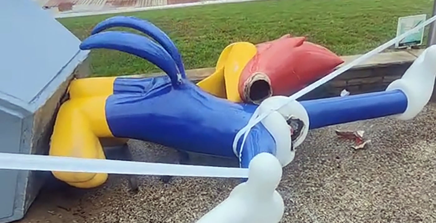 Daardoor verloor Woody zijn hoofd, zo is te zien op pijnlijke beelden die op TikTok verschenen. Ook is de binnenkant van de holle houten sokkel zichtbaar. De lokale politie heeft het plaats delict afgezet met witte linten, die om de romp van de mascotte heen zijn gebonden. Dat maakt het tafereel extra luguber.