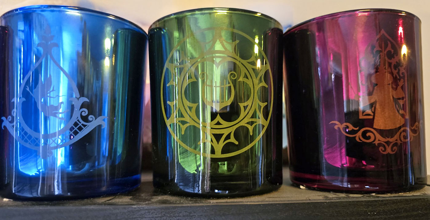Door er een waxinelichtje in te zetten, licht een Efteling-symbool op. De zeven glazen staan in het teken van Baron 1898 (groen), Symbolica (rood), Droomvlucht (rood en blauw), Danse Macabre (groen), Fata Morgana (rood) en de Winter Efteling (blauw).