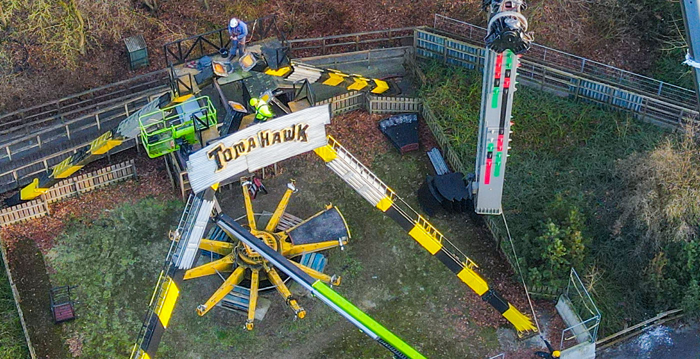 FOTO'S Walibi Holland is bezig met groot onderhoud bij de frisbee-attractie The Tomahawk. Nu het pretpark in Biddinghuizen gesloten is, hebben technici tijd voor winterse werkzaamheden. Bij de metershoge thrillride in parkdeel Zero Zone zijn de arm en de motor verwijderd.