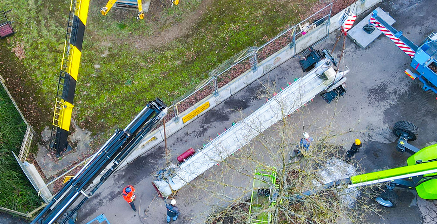 Op dronefoto's is te zien hoe de gedemonteerde onderdelen met een hijskraan de lucht in worden getakeld. Vervolgens worden ze op de grond geplaatst, klaar voor transport naar een gespecialiseerd onderhoudsbedrijf. Er staat ook een hoogwerker naast.