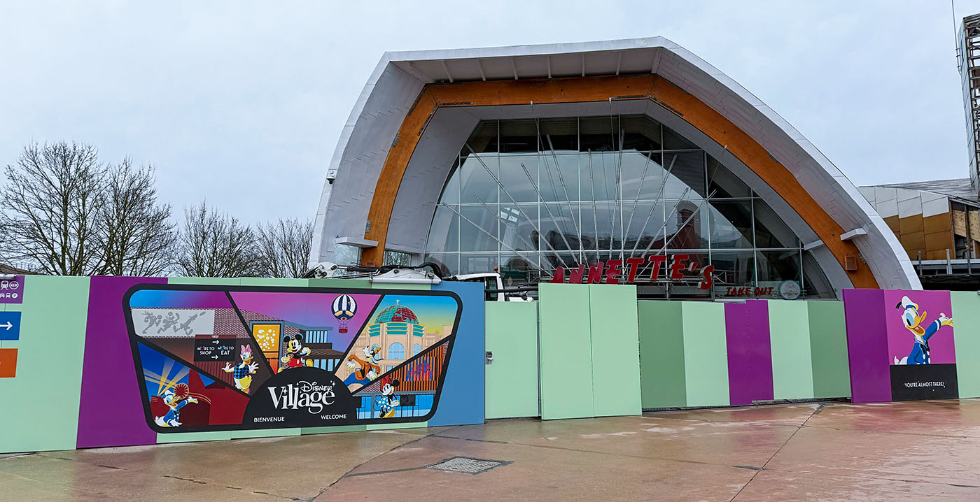 FOTO'S De volgende fase van de verbouwing van Disney Village in Disneyland Paris is aangebroken. Op dit moment worden de gevels van restaurant Annette's Diner en souvenirwinkel Disney Store ontmanteld. Beide locaties zijn sinds het einde van de kerstvakantie dicht. Ook op andere plekken in het uitgaansgedeelte wordt gewerkt.