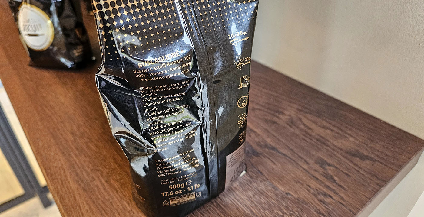 Voor één zak koffiebonen van 500 gram moet 25 euro neergeteld worden. Ze zijn "geroosterd, gemelangeerd en verpakt in Italië", zo lezen we op de verpakking. De instructies voor het zetten van de koffie staan daar ook op.