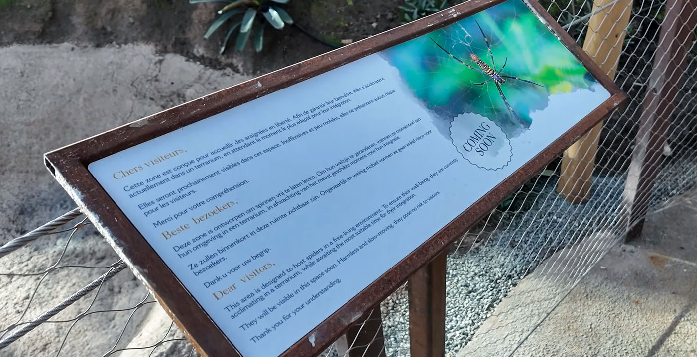 Om welke spinnensoort het gaat, wordt niet vermeld. Een bord verderop verraadt dat de spinnen momenteel nog niet aanwezig zijn. "Om hun welzijn te garanderen, wennen ze momenteel aan hun omgeving in een terrarium, in afwachting van het meest geschikte moment voor hun integratie", luidt de uitleg.