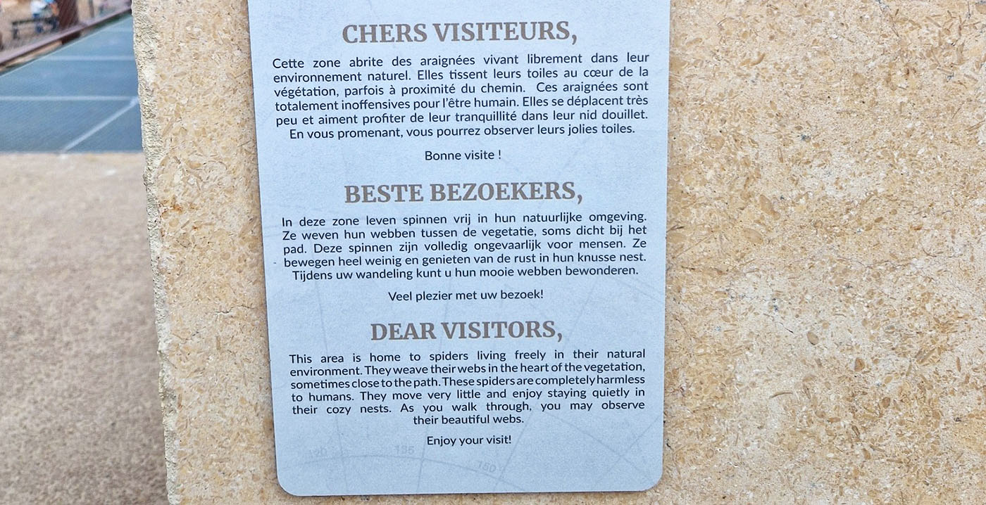 Volgens de tekst bewegen de spinnen weinig en verblijven ze rustig in hun nest in het doorloopverblijf. Passanten kunnen tijdens een wandeling hun webben tegenkomen en observeren. "Tijdens uw wandeling kunt u hun mooie webben bewonderen." Er staat ook een waarschuwingsbord met een tekening van een spin bij.