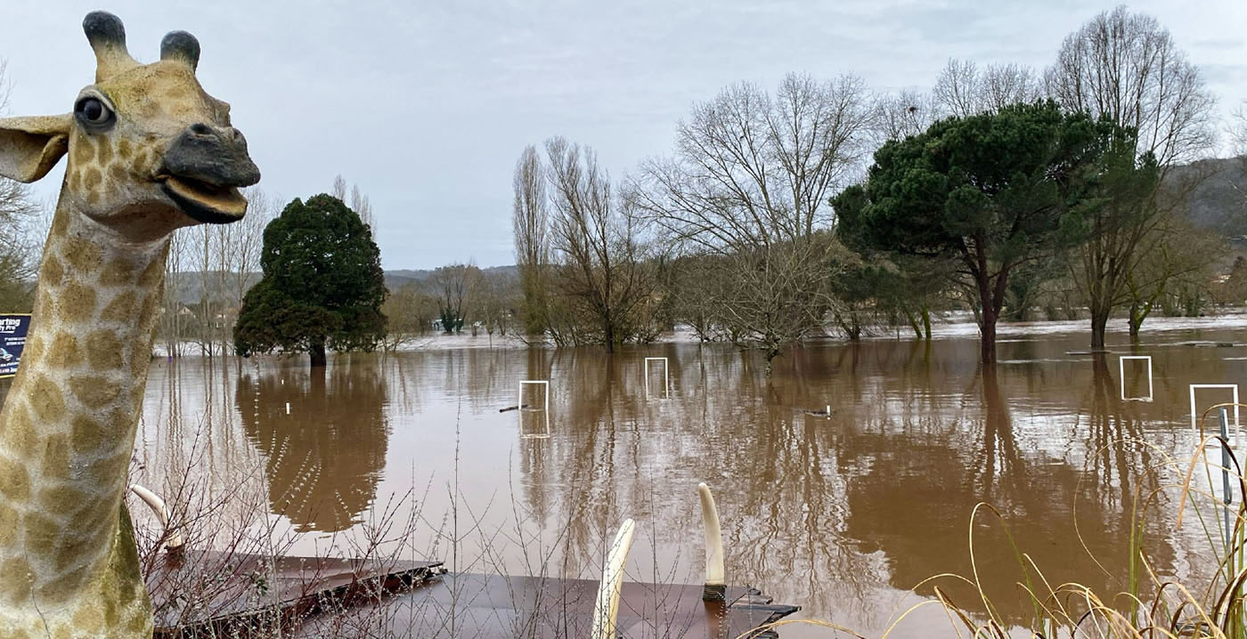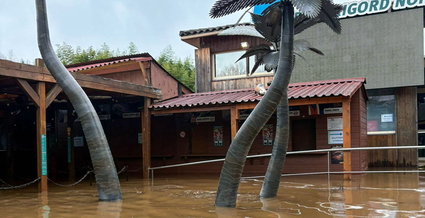 FOTO'S Twee Franse recreatieparken blijven tot nader order gesloten vanwege zware overstromingen. De storm Nils zorgde in de regio Dordogne voor hevige regenval en hoge waterstanden. Dat had grote gevolgen voor toeristische trekpleisters: het Aquarium Périgord Noir en beide vestigingen van Univerland.