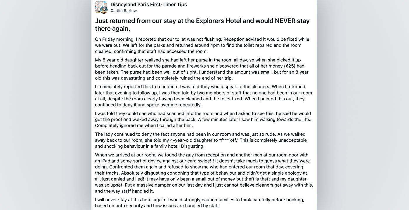 Barlow kreeg te horen dat het probleem zou worden verholpen terwijl het gezin in de Disney-parken was. Toen de vrouw rond 16.00 uur terugkeerde, was het toilet inderdaad gerepareerd en de kamer schoongemaakt. Kort daarna ontdekte haar 8-jarige dochter dat er geld uit haar portemonnee was verdwenen.