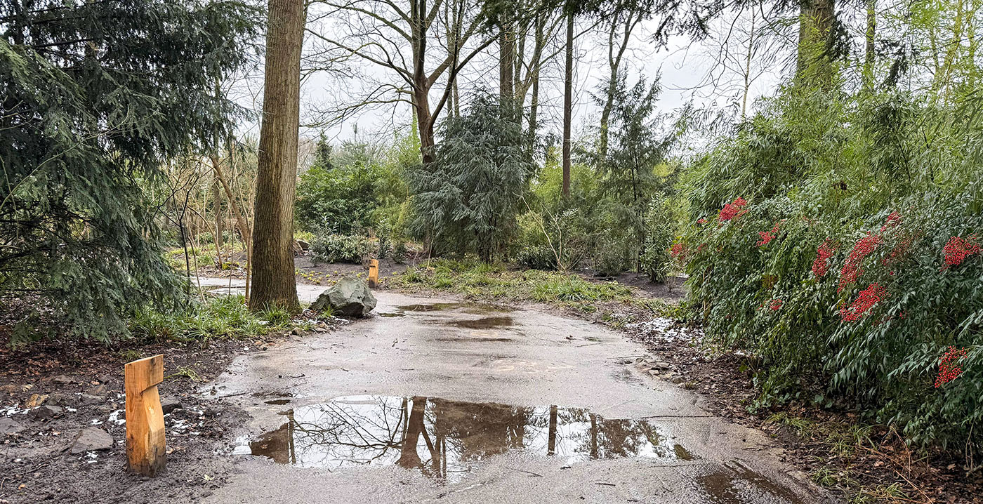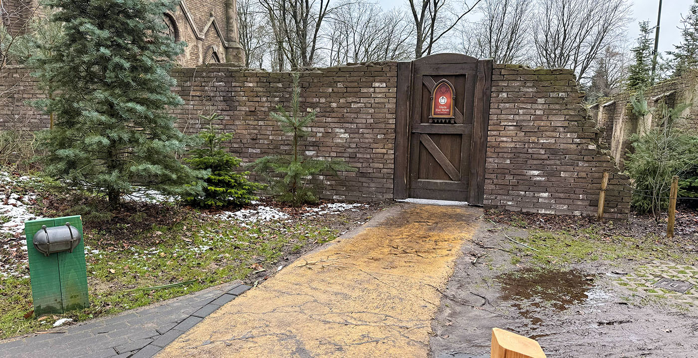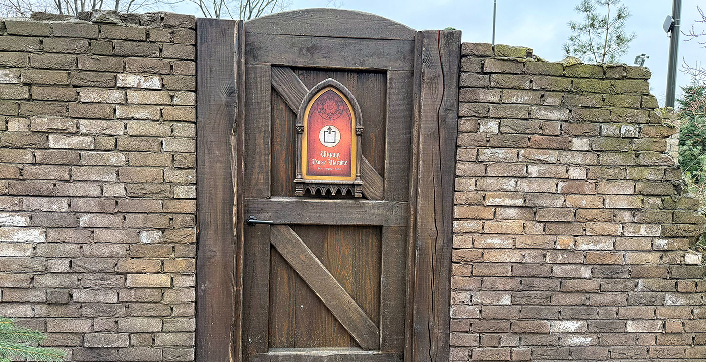 FOTO'S Omdat Danse Macabre voor sommige Efteling-bezoekers net iets te griezelig kan zijn, beschikt de attractie over een speciale chicken exit: wie na het volgen van de buitenwachtrij toch niet naar binnen wil, kan het gebied verlaten via een apart paadje. Vanwege veranderingen in de omgeving moest de wandelroute gewijzigd worden.