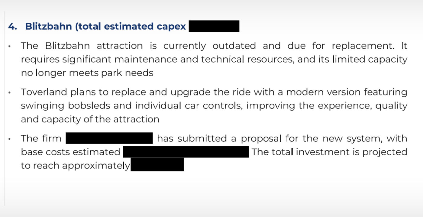 Even verderop worden de fabrikant, de basiskosten en de totale investering genoemd, maar die passages zijn grotendeels gecensureerd omdat ze concurrentiegevoelig zijn. Looopings kon eerder al wel melden dat Toverland in zee wil gaan met de Limburgse attractiebouwer ETF Ride Systems voor een nieuw attractietype, dat vergelijkbaar is met de bestaande attractie.