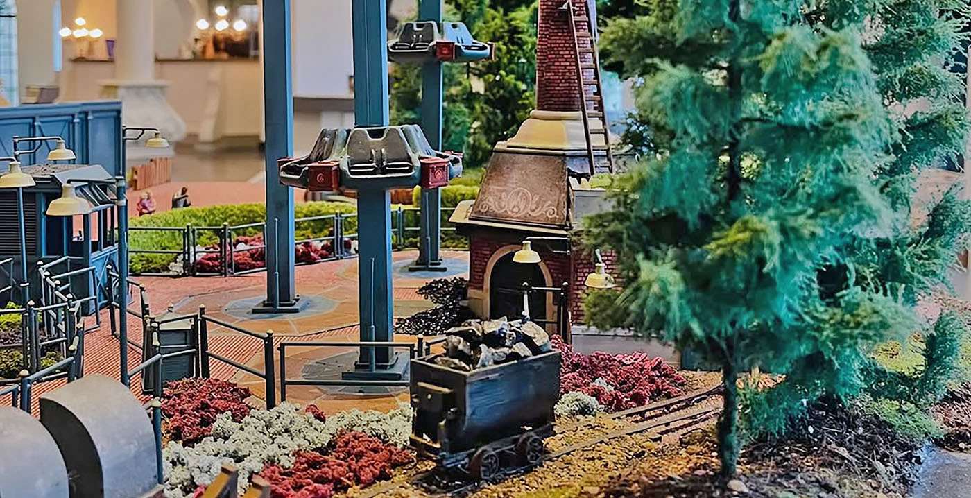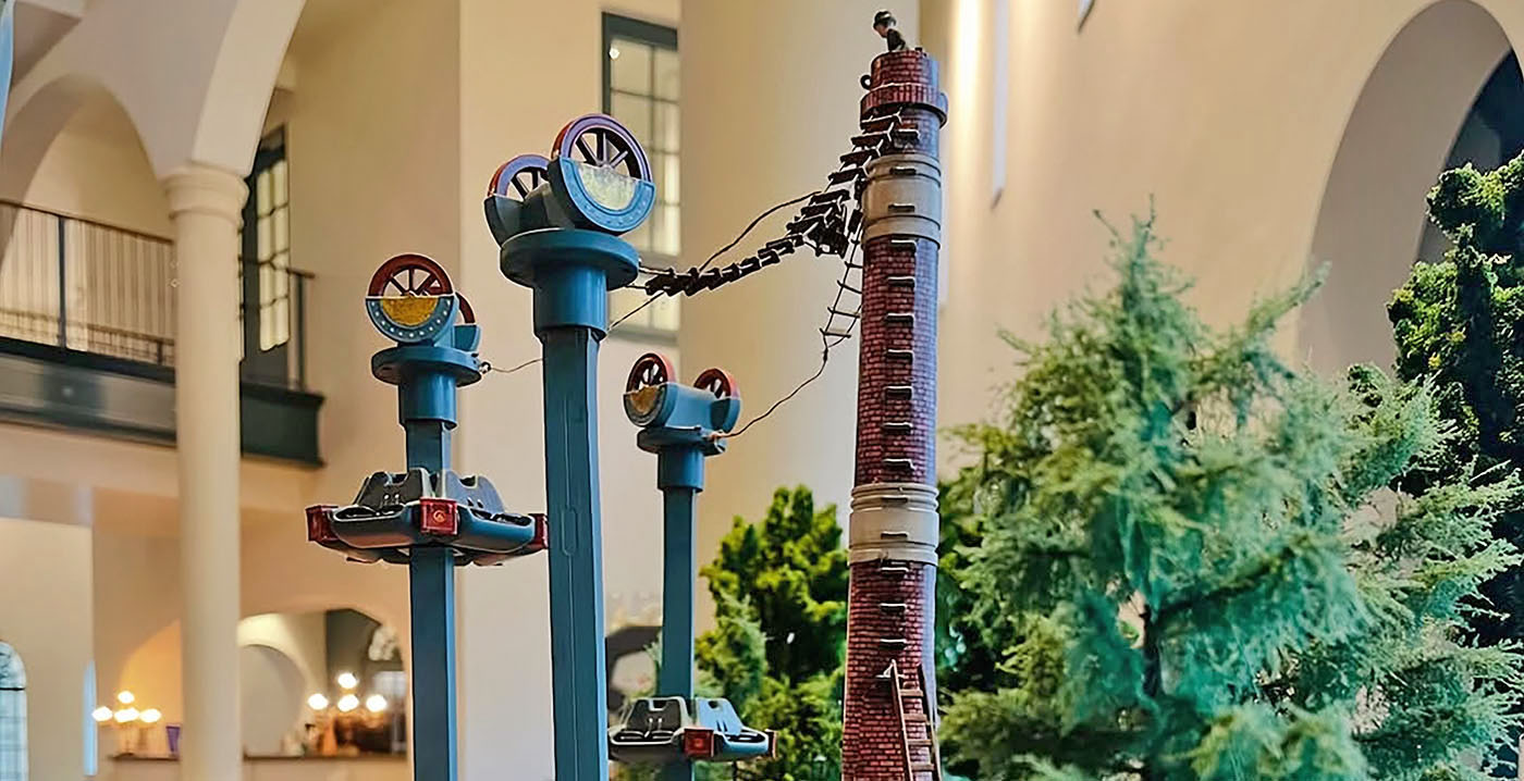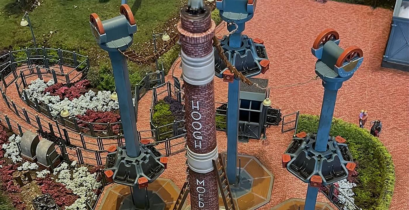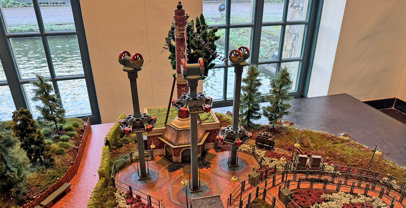 FOTO'S Een nieuwe maquette laat zien hoe de Efteling-attractie Hooghmoed eruit komt te zien. In de receptie van Efteling-kantoorgebouw Raveleijn staat sinds deze week een gedetailleerd schaalmodel van de drie vrijevaltorens, gesitueerd direct naast dive coaster Baron 1898.
