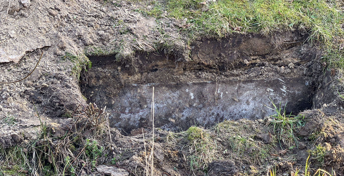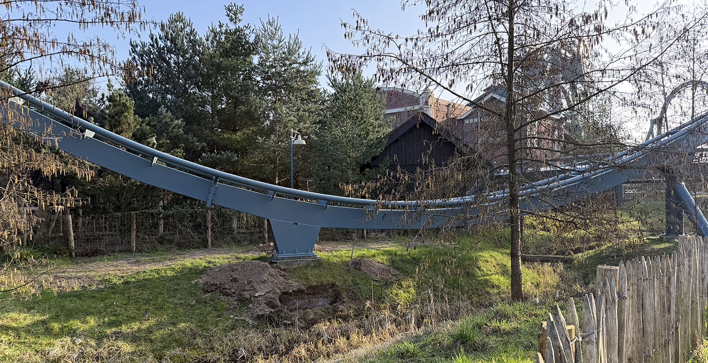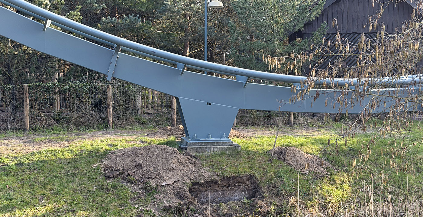 Het gaat om één funderingsblok aan het einde van het parcours, tussen de zogeheten helix en de bocht vóór de remmen. Rond de steunpilaar is de grond weggehaald, waardoor de betonnen fundering zichtbaar is geworden. Mogelijk is er iets aan de hand met de betonpoer zelf, of de grond eronder.