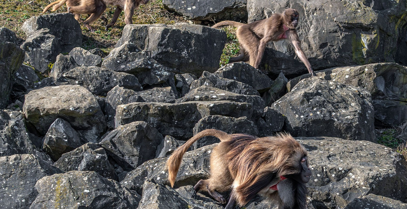 Gelada's behoren tot de bavianenfamilie en leven normaal gesproken in haremgroepen: meerdere vrouwtjes met hun jongen en één dominant mannetje. In de dierentuin leven vier van zulke harems samen in één grote groep, vergelijkbaar met de sociale structuur in het wild.