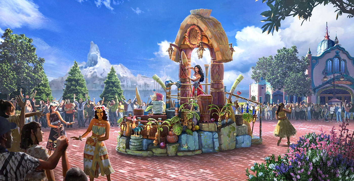 Zij verschijnen elk op een eigen wagen. Eén van de praalwagens staat in het teken van Moana. Op conceptbeelden is te zien hoe zij op een tropisch ogende wagen staat, omringd door elementen die verwijzen naar haar eiland Motunui en de bewoners.
