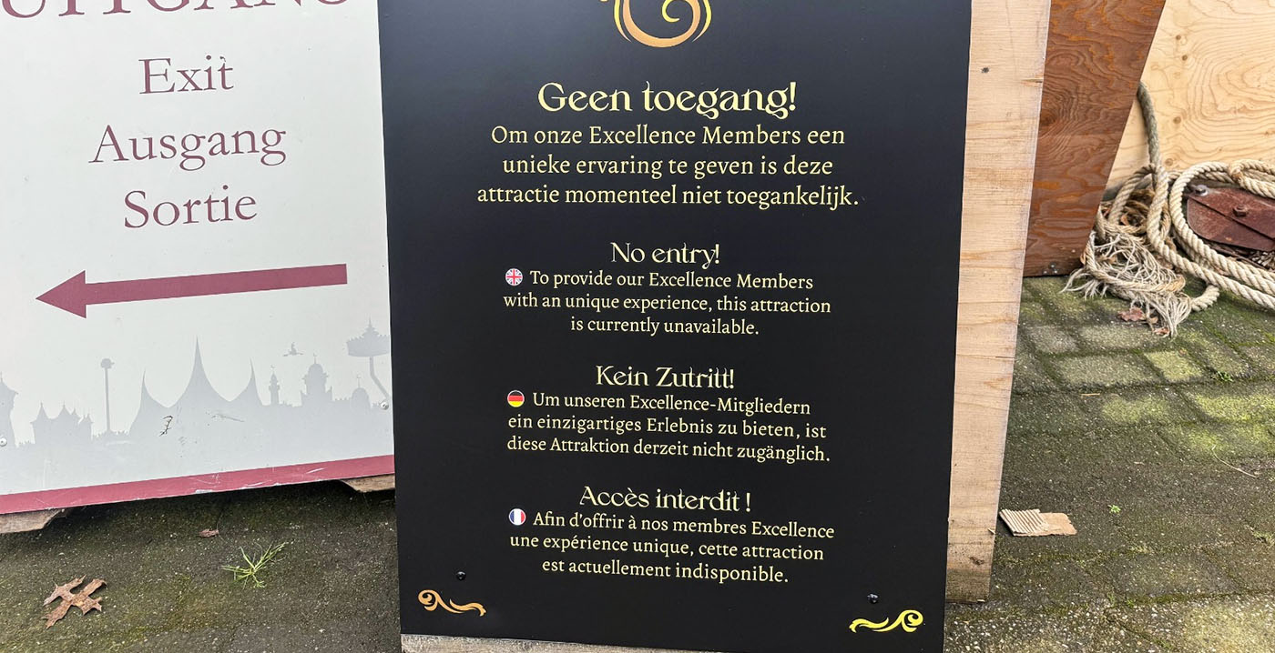 "Om onze Excellence Members een unieke ervaring te geven is deze attractie momenteel niet toegankelijk", luidt de letterlijke tekst. Met andere woorden: de attractie is alleen geopend voor vips. Er is ook een gouden Efteling-E zichtbaar. Daaronder staan vertalingen in het Engels, Duits en Frans.