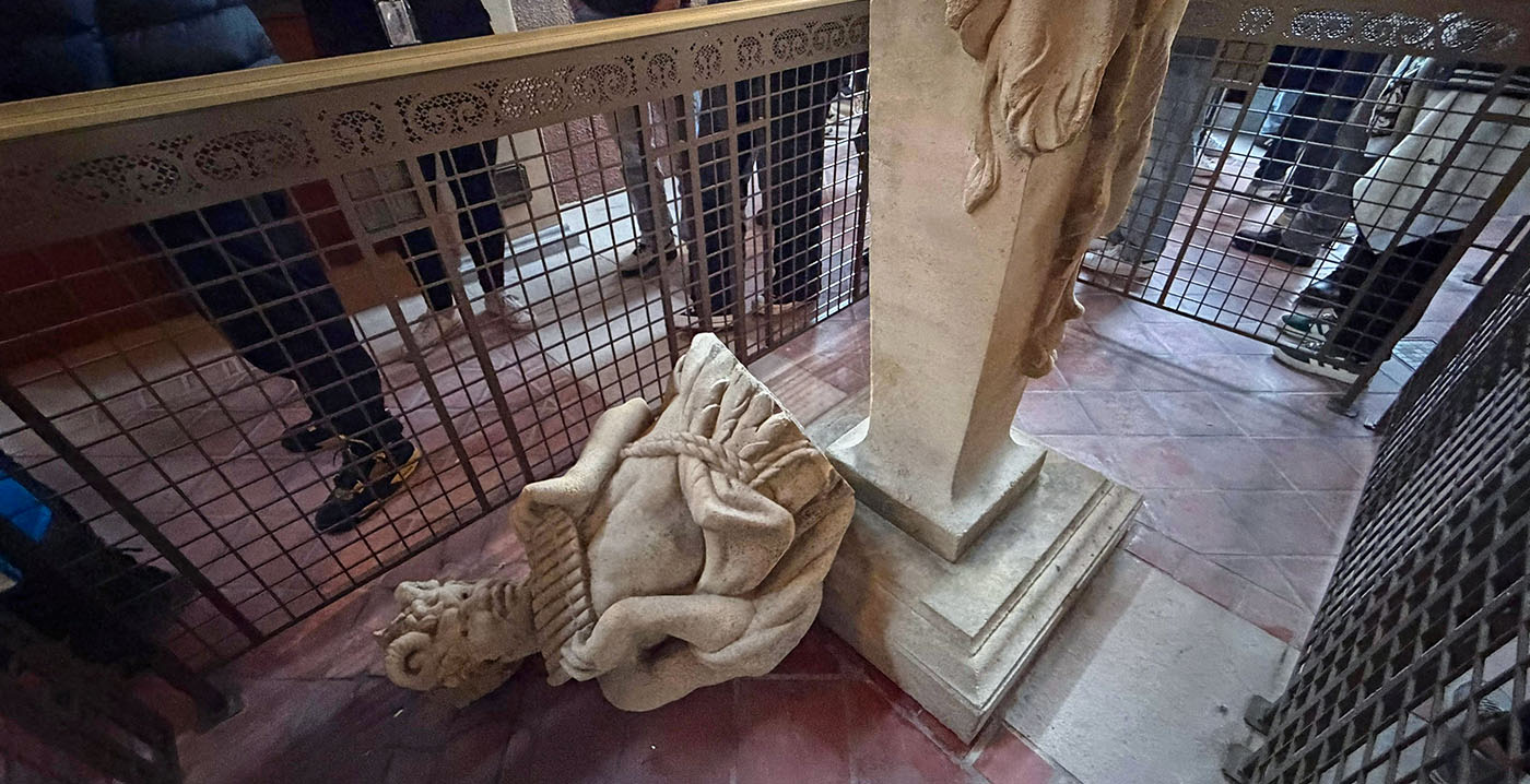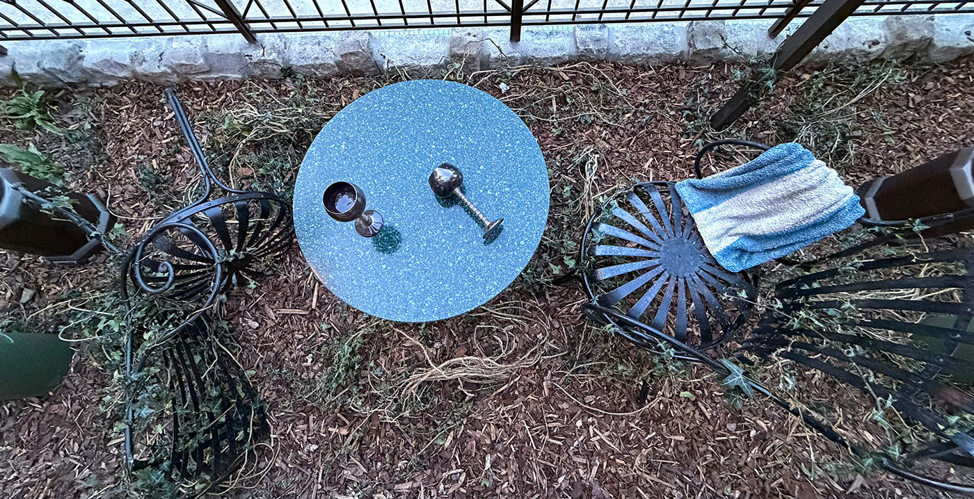 Rondom het voormalige bad staan palmbomen, passend bij de Californische setting. Ook verspreid door het gebied liggen sporen van verval. Omgevallen stoelen zijn overwoekerd met klimop, op een tafel staat een omgevallen cocktailglas en een verbleekte parasol hangt scheef. Op de grond ligt een kapot beeld van de god Pan, waarvan het bovenste deel is afgebroken. De ogen lijken bezoekers te volgen.