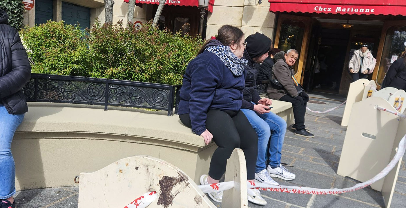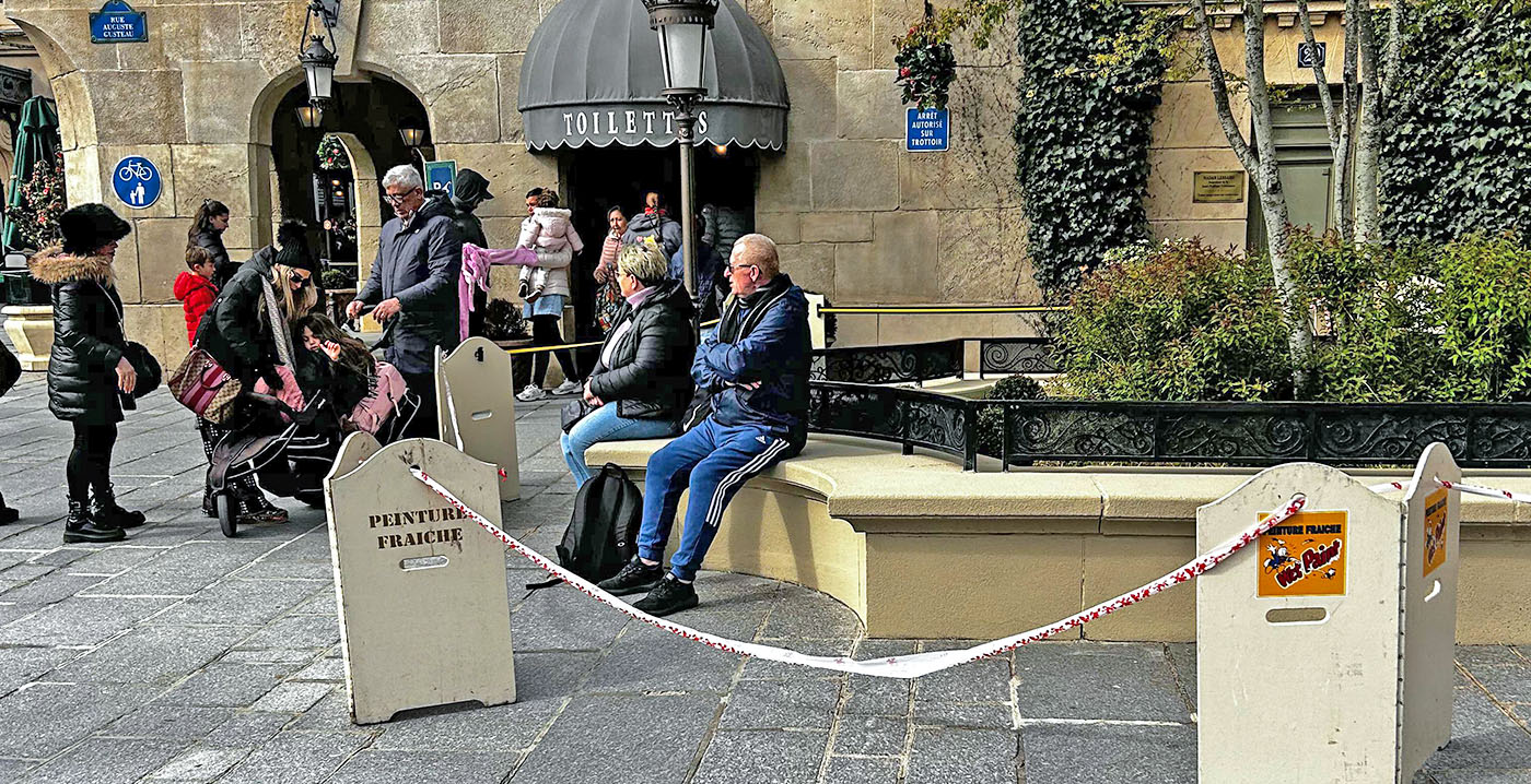 Er werd geverfd op het plein bij de attractie Ratatouille, voor souvenirwinkel Chez Marianne. Disney-medewerkers hadden de muurtjes afgesloten met linten en klapborden waarop in twee talen - Engels en Frans - werd gewaarschuwd voor natte verf, met de termen "wet paint" en "peinture fraiche".