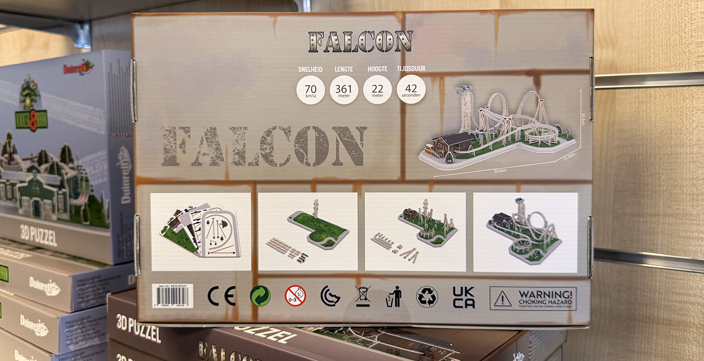 De mini-Falcon is 53,5 centimeter lang, 31,5 centimeter breed en 25,5 centimeter hoog. Duinrell vraagt 22,50 euro per stuk voor de bouwpakketten. Genodigden die deze week waren uitgenodigd om de nieuwe Kikker8baan als eerste te proberen, kregen als verrassing een puzzel van de bewuste attractie mee naar huis.