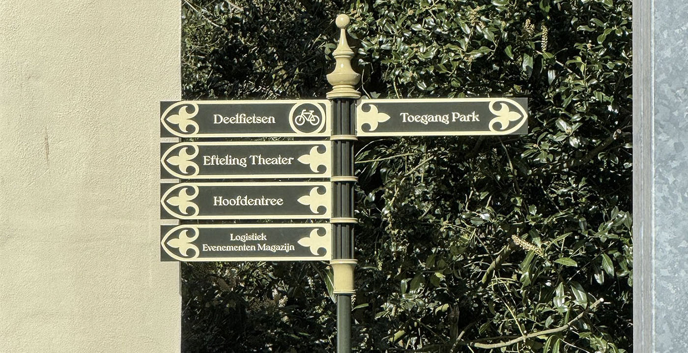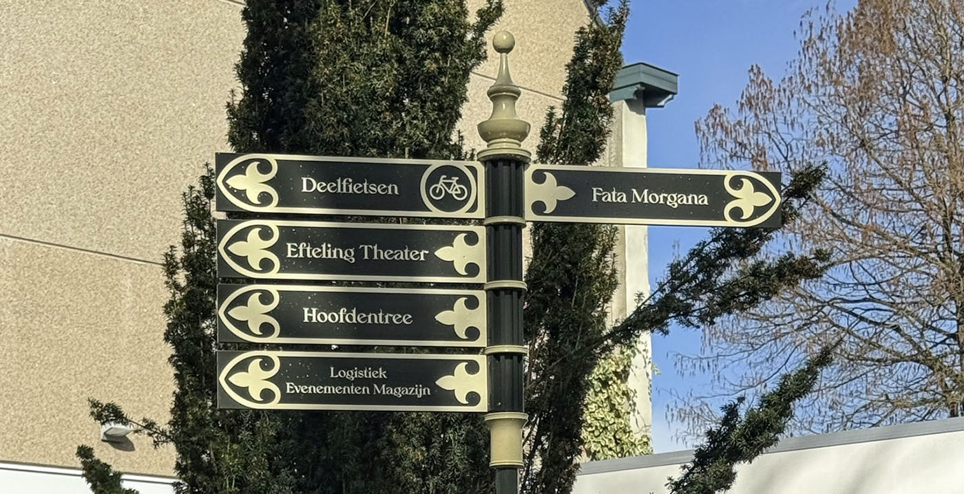 De bewegwijzering stamt uit 1996. Toen introduceerde de Efteling op verschillende knooppunten in het park donkergroene palen met bordjes voorzien van een gouden omkadering met een Franse lelie. Ze zijn afgelopen zomer vervangen door nieuwe wegwijspalen met een ander design.