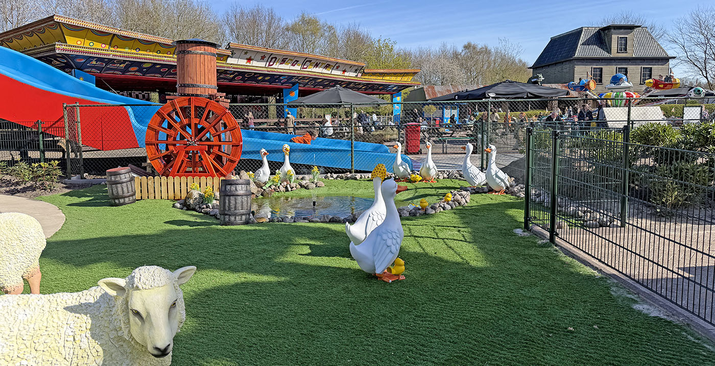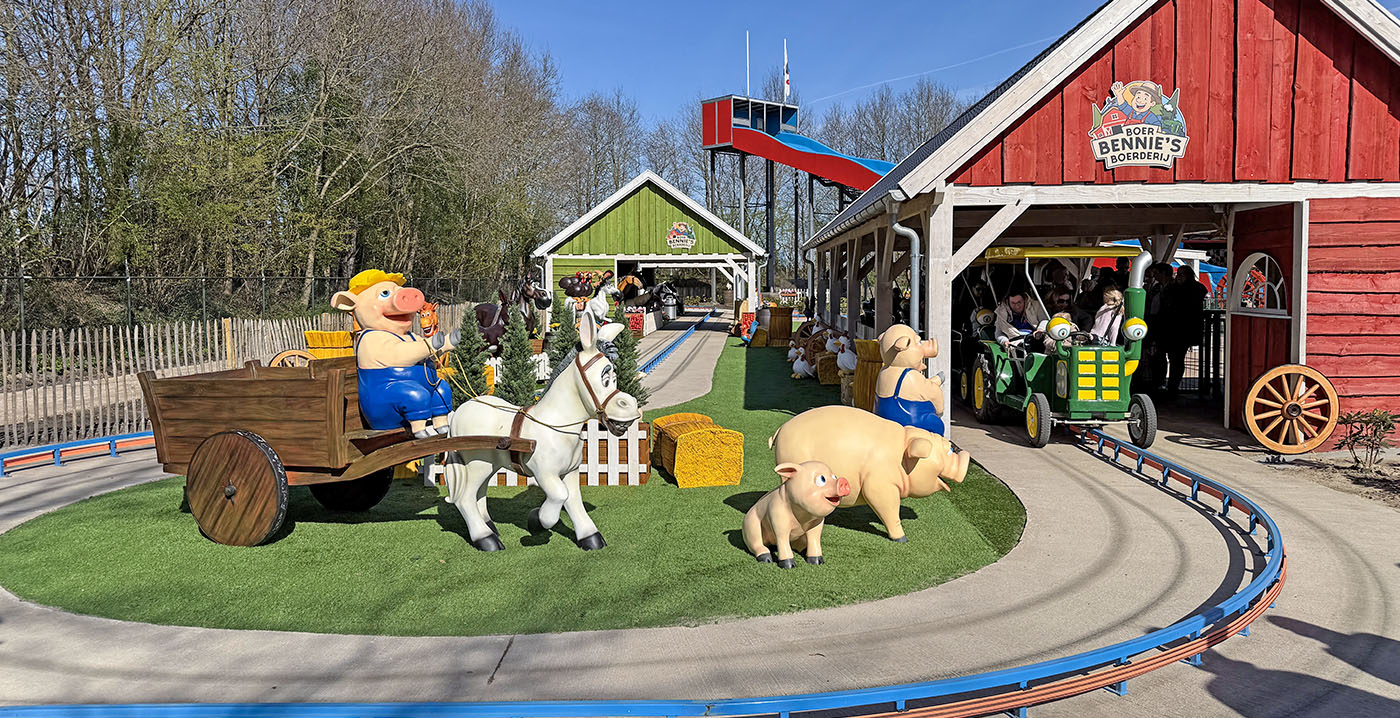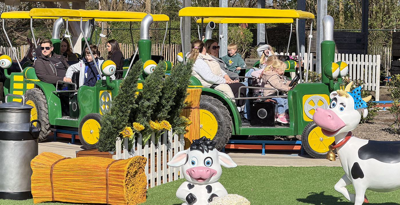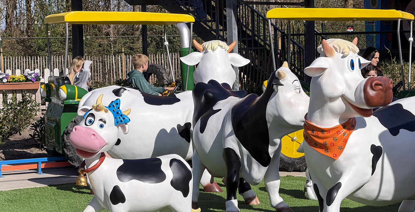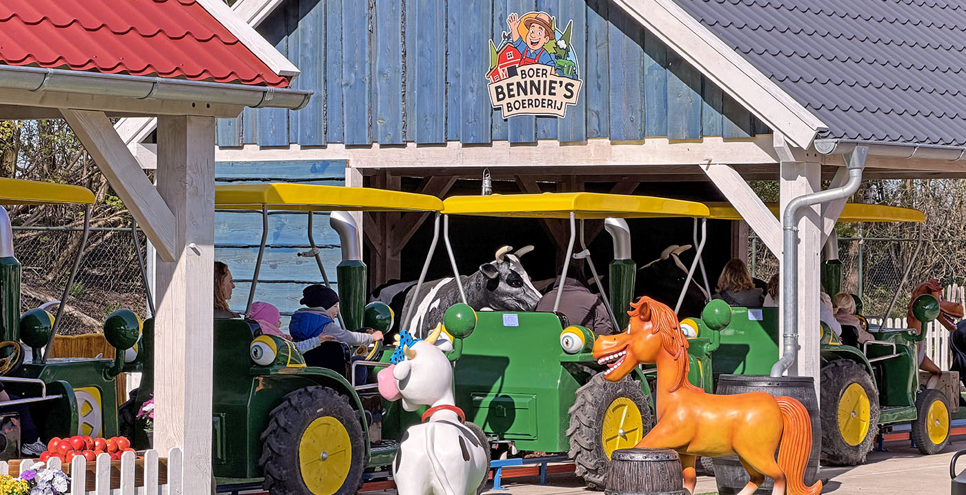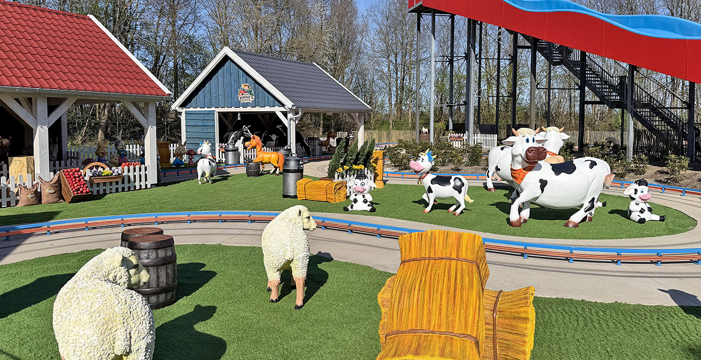 Een trein met tractoren rijdt over een uitgestrekt terrein met houten huisjes en beelden van koeien, paarden, varkens, schapen en ganzen. Sommige figuren bewegen ook. Een reuzenrad met zeilscheepjes en een zweefmolen maken het vernieuwde aanbod compleet.
