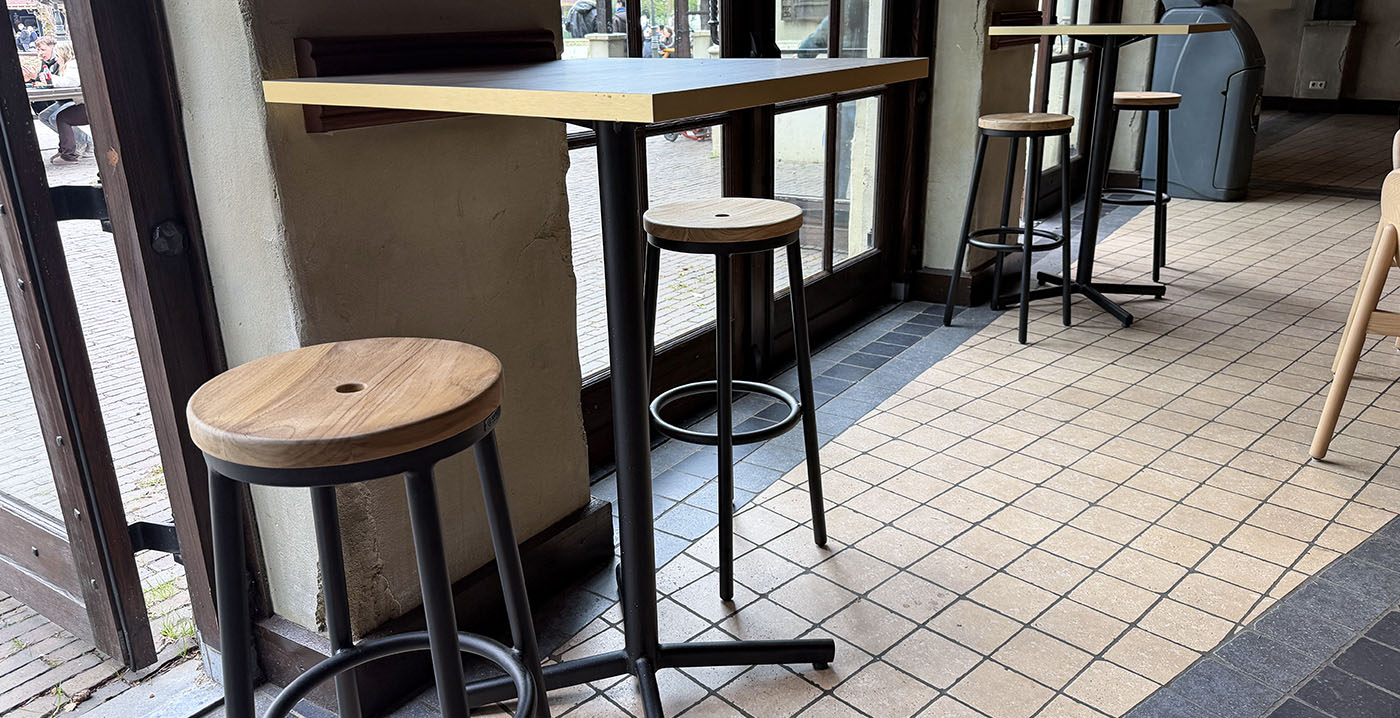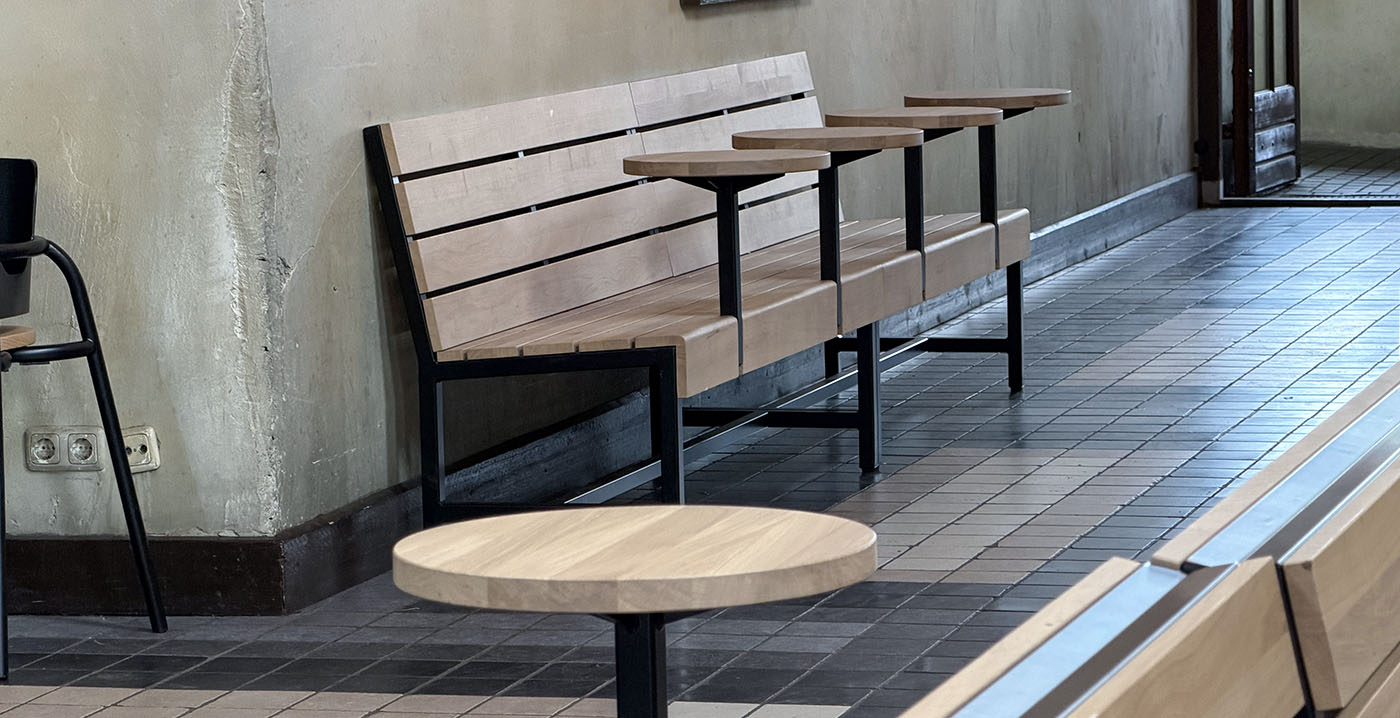 Robuuste, donkerbruine meubels moesten plaatsmaken voor lichte houten tafels, banken en krukken met strakke vormen en zwarte metalen onderstellen. In de centrale gang vallen banken met geïntegreerde, ronde tafeltjes op. De stoelen zijn voorzien van een reliëf in de rugleuning, met een geometrisch ruitpatroon.