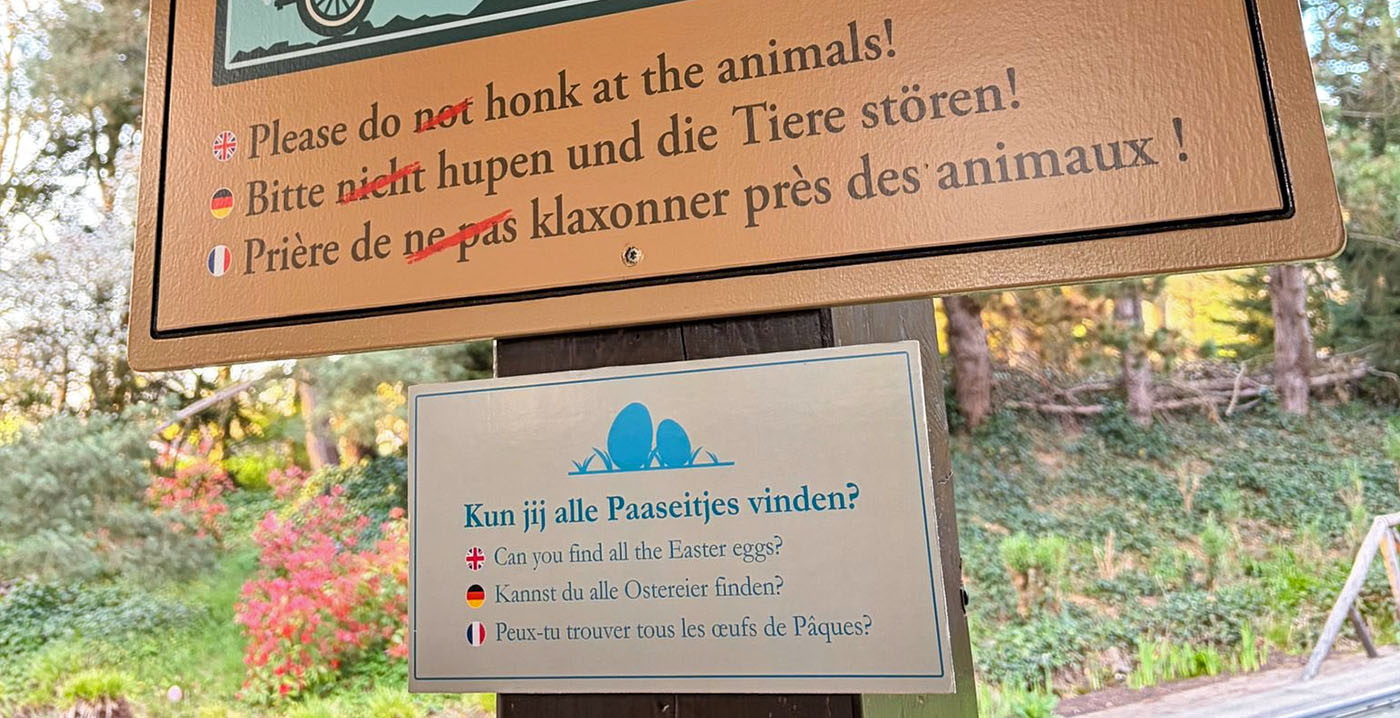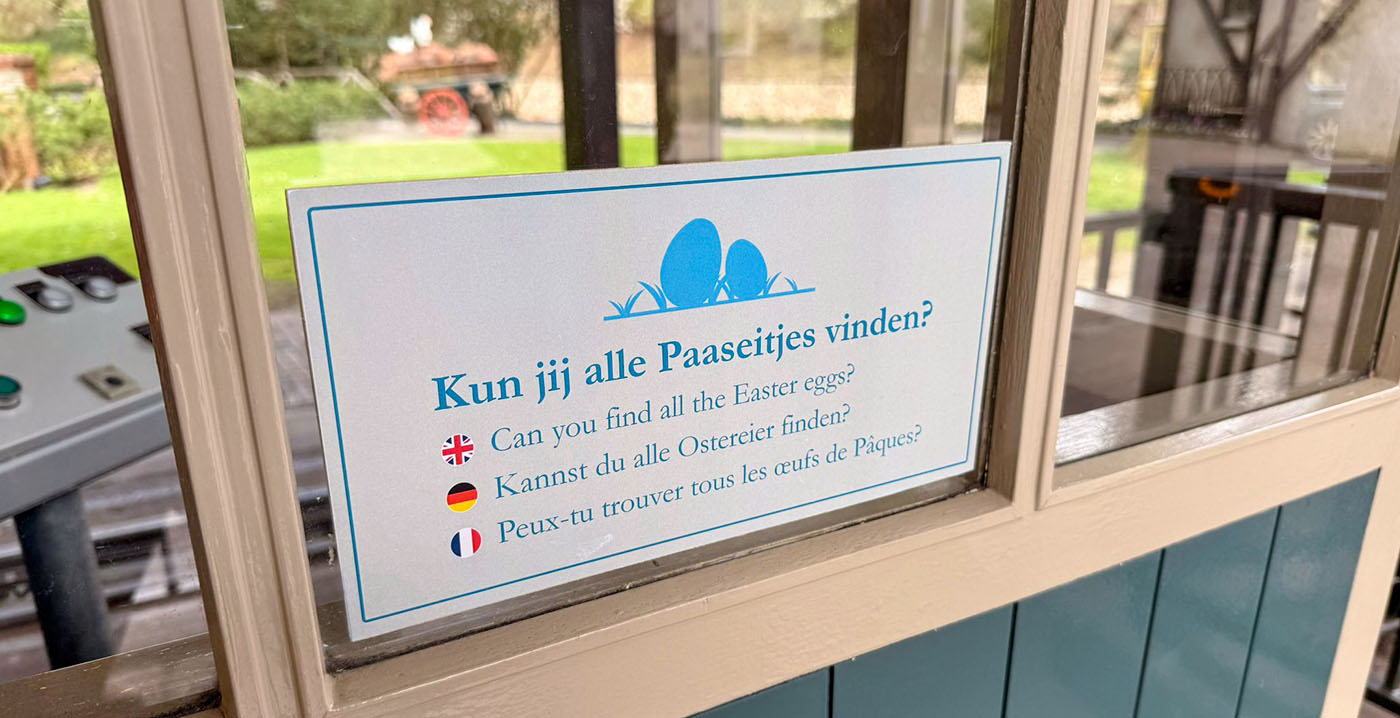 "Kun jij alle paaseitjes vinden?", valt te lezen op bordjes in de wachtrij. Daaronder staan vertalingen in het Engels, Duits en Frans. Het gaat om een initiatief van het personeel, dat voor een tijdelijke beleving opvallend professioneel is aangepakt.